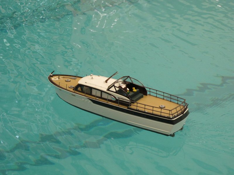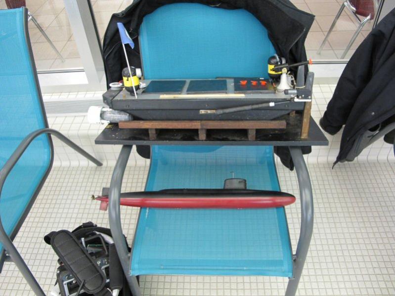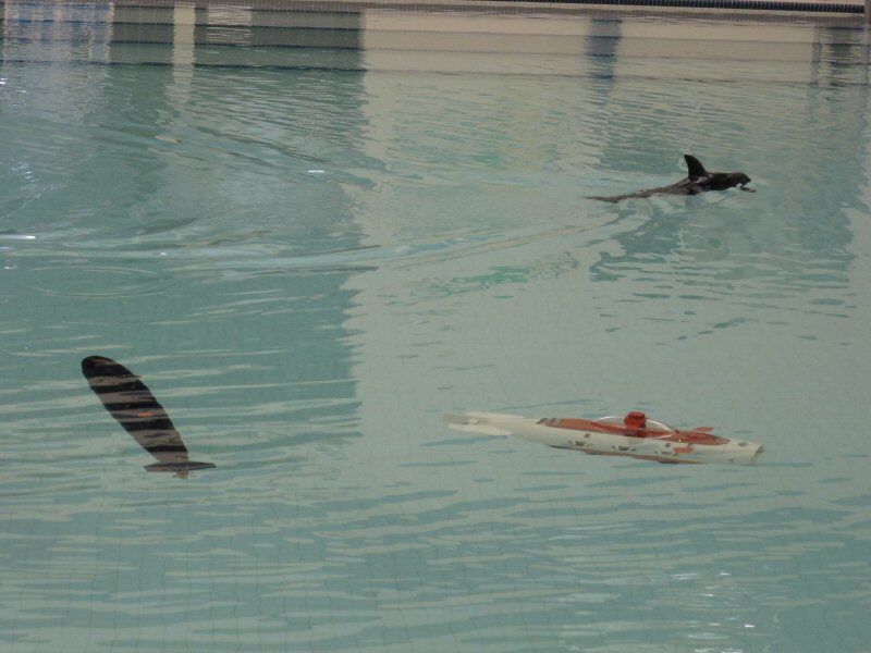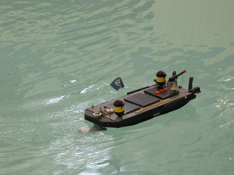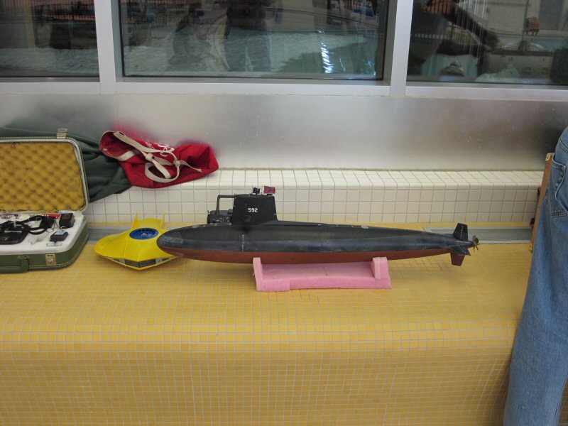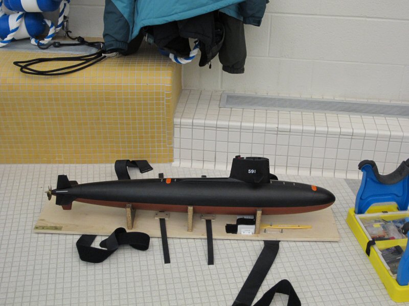 That is indeed my partly completed build of an original issue FS-1 kit that I've had laying around for far too long. Last month and this were my first two test runs, both unfortunately cut short by a faulty seal that refuses to stay glued to the aft end cap. What I learned from these short runs is that the FS-1 wants to dive if ballested level, even with just a little forward way on. Deflecting the jet thrust upward a bit wouldn't overcome this tendency. Adding an ounce of weight so she floats somewhat nose up made a big difference though, and she ran quite level. Now I need to play with adjusting the foam so she sits level on the surface too. As BD said, still dialing her in.