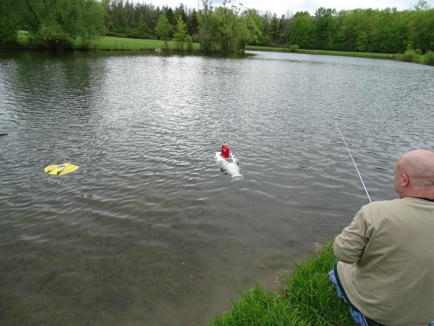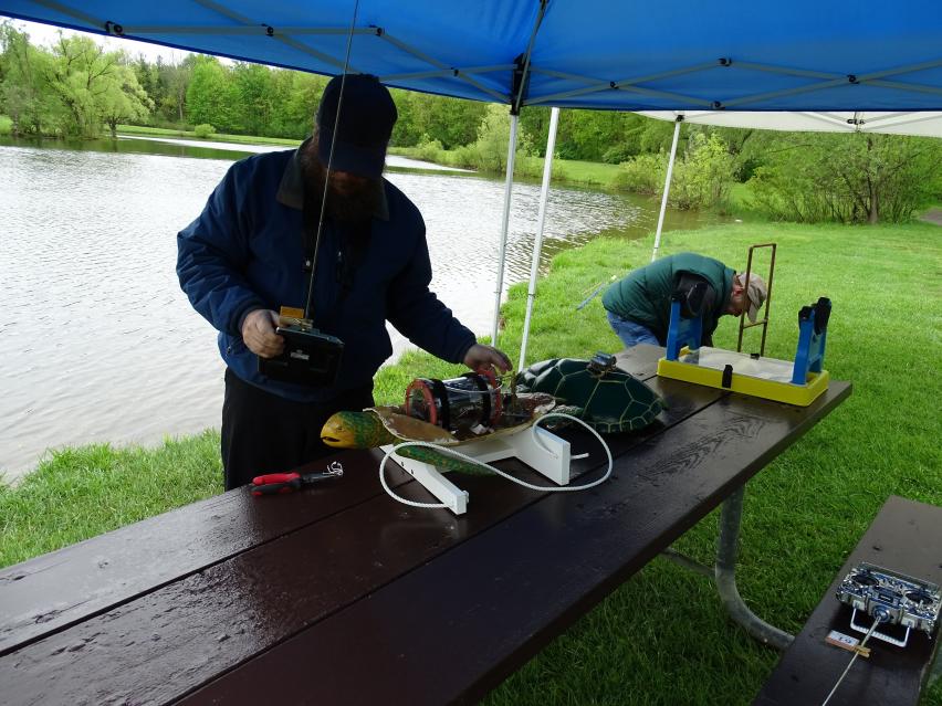 I took my sea turtle and killer whale subs (plus a truck) to run. The whale went quite well, as usual. The sea turtle had a new motor in it, more speed and power to try and get the performance up a bit. That worked out to be the case, so much so that it snapped the timing belt connecting the motor to the twin prop shafts! Sigh. Some redesign needed there!Anyway, here are some pics from the day: