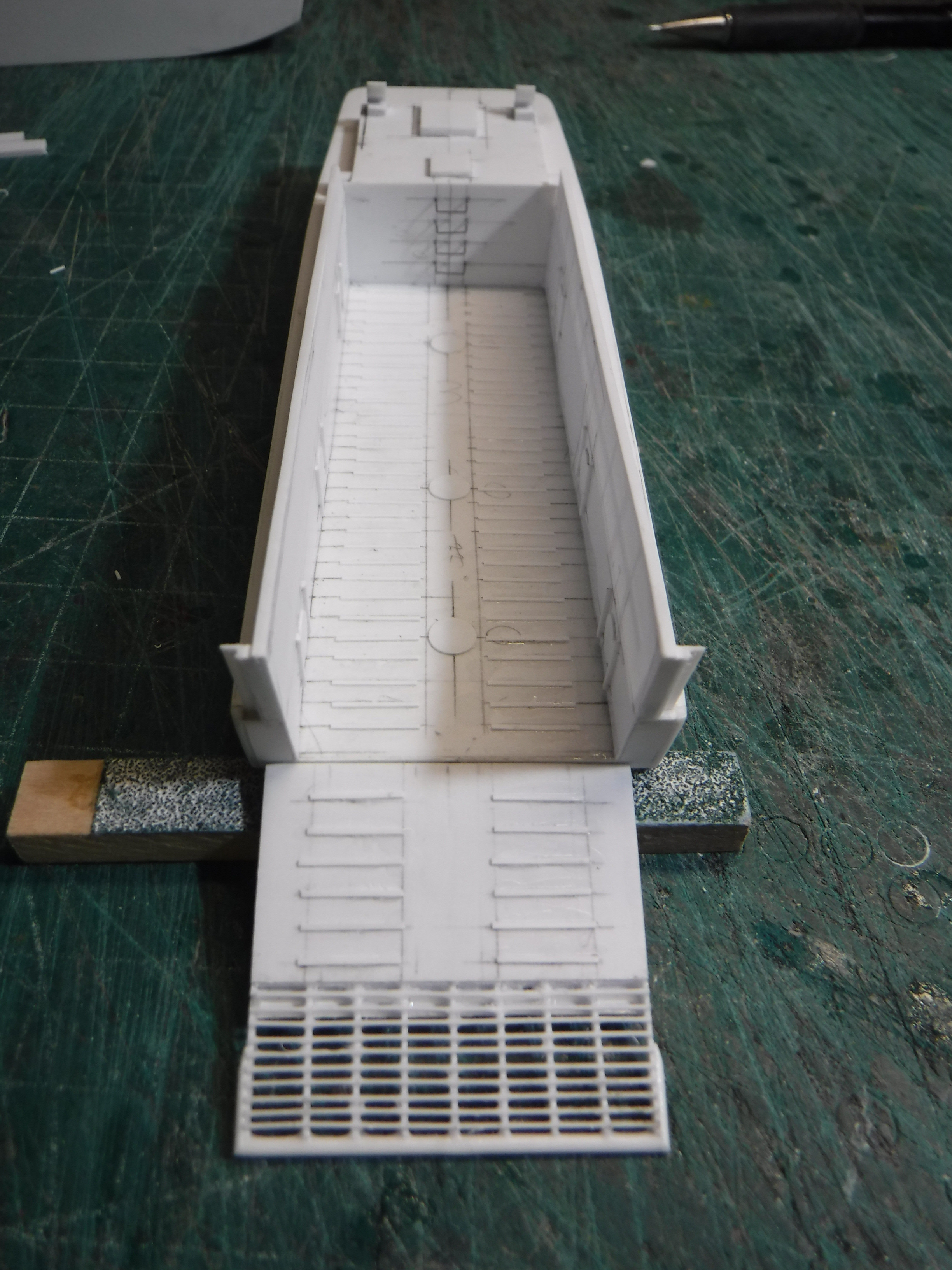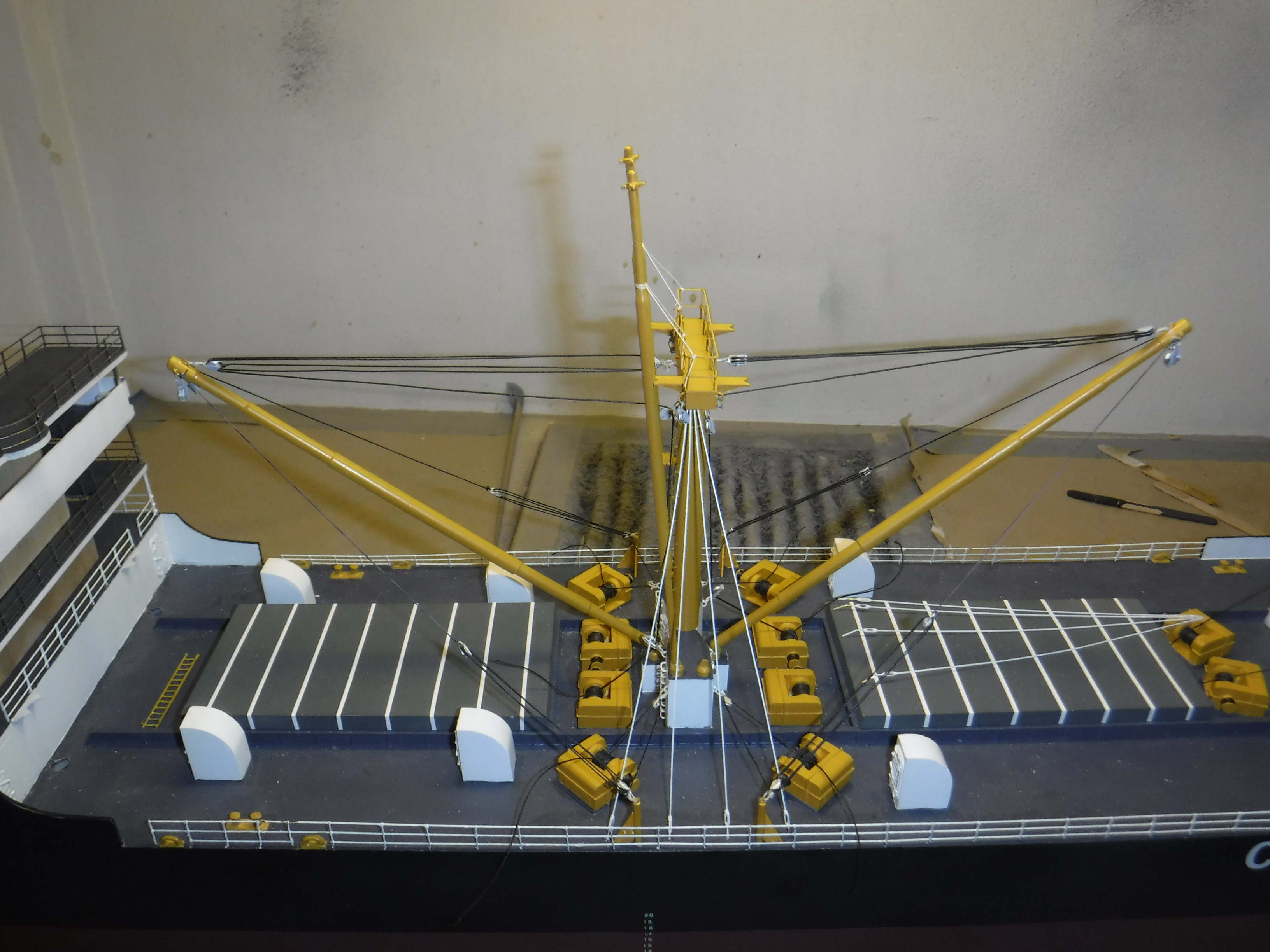 USCGC KUKUI (WAK 186) is the black hulled Coast Guard freighter. KUKUI was an ALAMOSA class cargo ship that built, repaired and supplied the LORAN stations in the Pacific, The model is in 1/96th scale and is 42.375" long and 6.25" beam; and weighs 11 pounds. Here are the answers to some of the questions I was asked. The 14 cargo winches took 43 hours to build and paint. The LCM-3's took 65 hours to build. The cargo boom rigging took 14 hours.