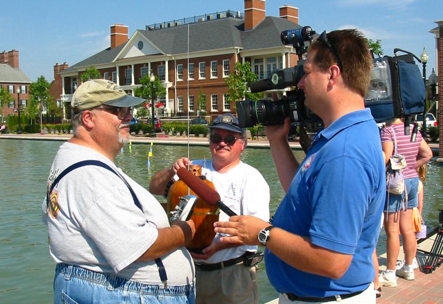 Here's a shot of Big Dave Welch (left) being interviewed by the local NBC affiliate at the 2005 Carmel SubRegatta. He is assisted by Don May holding Dave's fabulous model of Bushnell's Turtle.