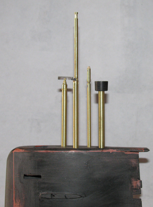 The tall mast has a piece of solid brass rod for the top section and the groove was made with a file while spinning in a drill press.