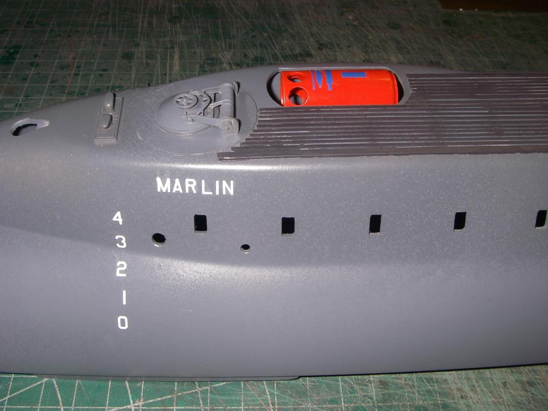 Bought this MARLIN kit about 10 years ago, and finally got around to building it. The only thing I haven't finished is the WTC and electronics. For applying draft marks, I use a Post-it note and lay out the measurements along the glue side. I cut out the template and attach it to the model, and apply dry transfer numbers. I decided to have a little fun with the rescue buoy and applied some pin stripe tape to it.