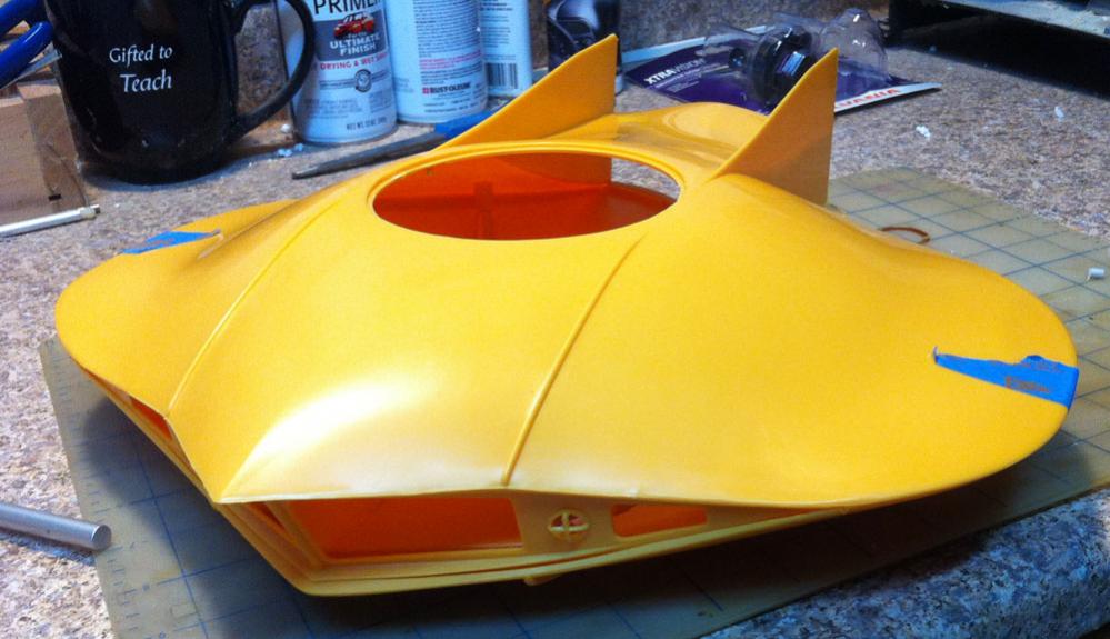 For a little unnecessary background, the kit is of the Flying Sub (FS-1) which was attached to the SSRN Seaview from the '64-'68 TV show "Voyage to the Bottom of the Sea" (VTTBOTS). I have very early memories of the FS-1 flying across the screen during the opening credits. Must've been the final season. Anyway, my dad and I built several of the Aurora kits growing up. While I hear the design is an acquired taste for some, I've always really liked it.