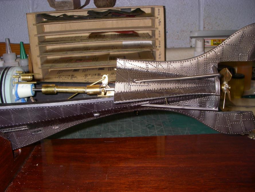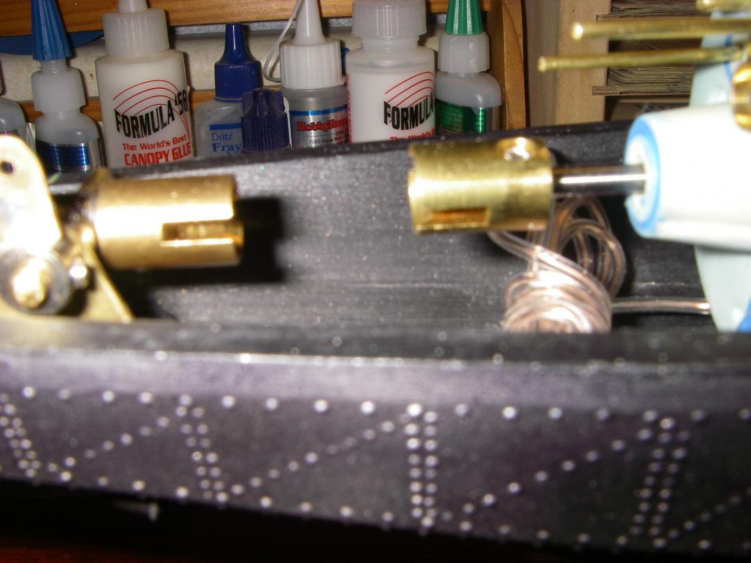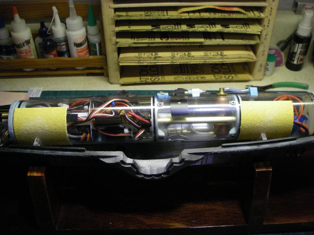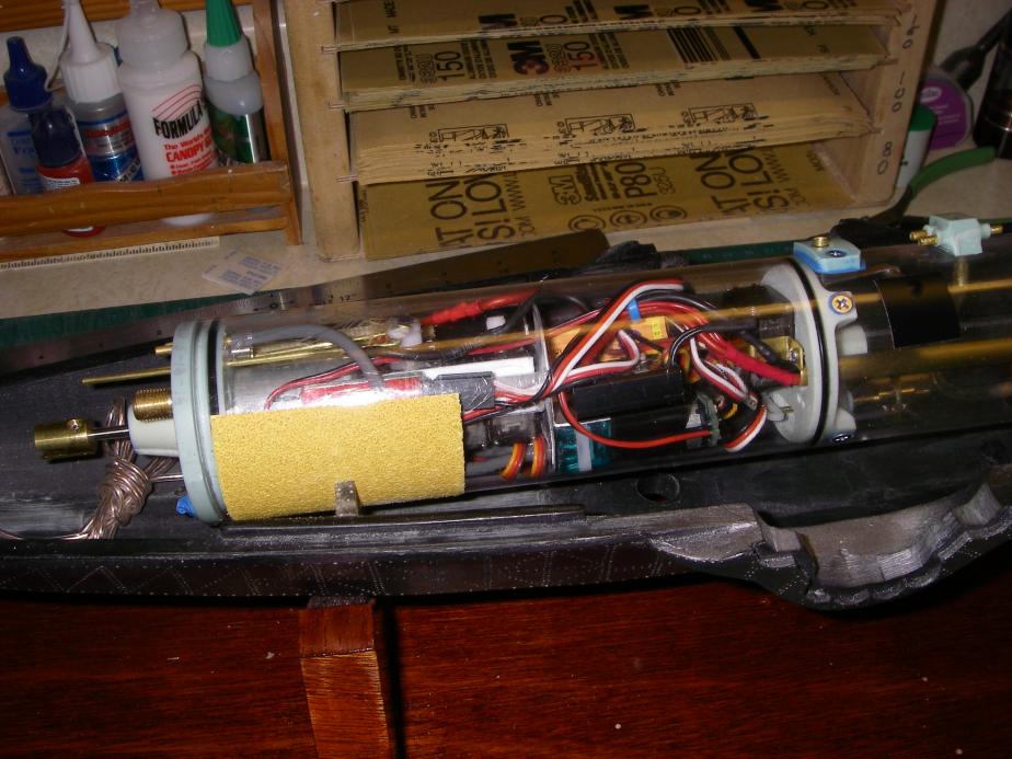 I got the receiver, LiPo guard and ADF installed in the cylinder today. I relocated the ESC from the centerline to the starboard side, after lengthening the wires to the motor. The wires leading from the ESC to the battery were laced together with some #1 braided black silk suture thread. I shortened the leads of the three servos in the tray by 4". I installed some new plugs from EMS. I had my wife assist me with programing the ADF; she plugged in the battery while I held the ADF "set" button. I had installed the WTC saddles before I received the WTC; the universals are misaligned by about 1/8". I'll correct the discrepancy on the saddles by attaching some sandpaper to the cylinder and sanding them down.