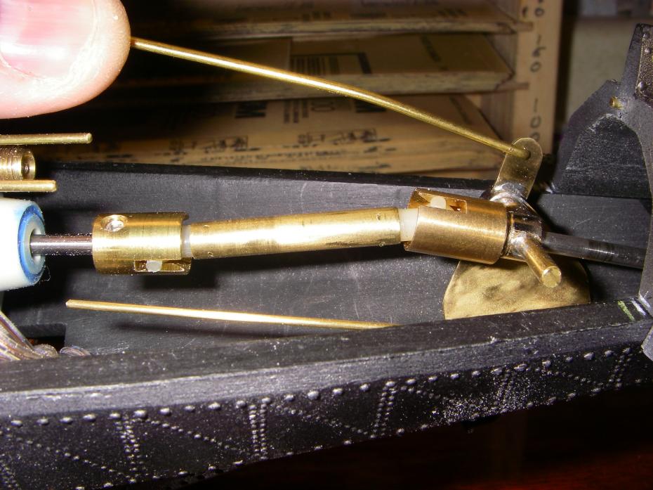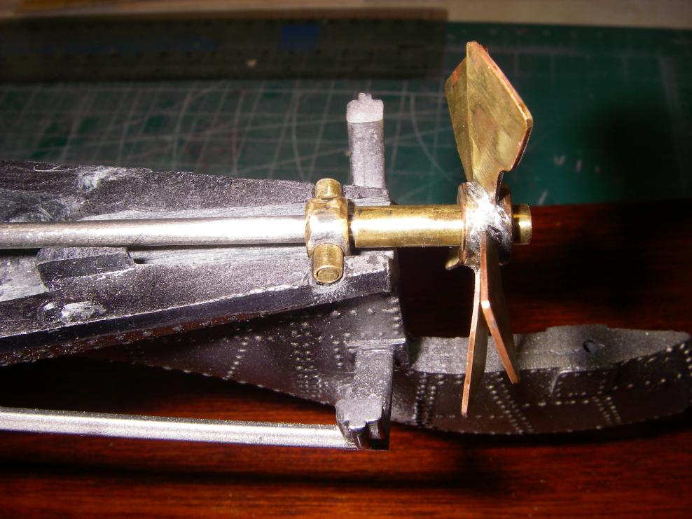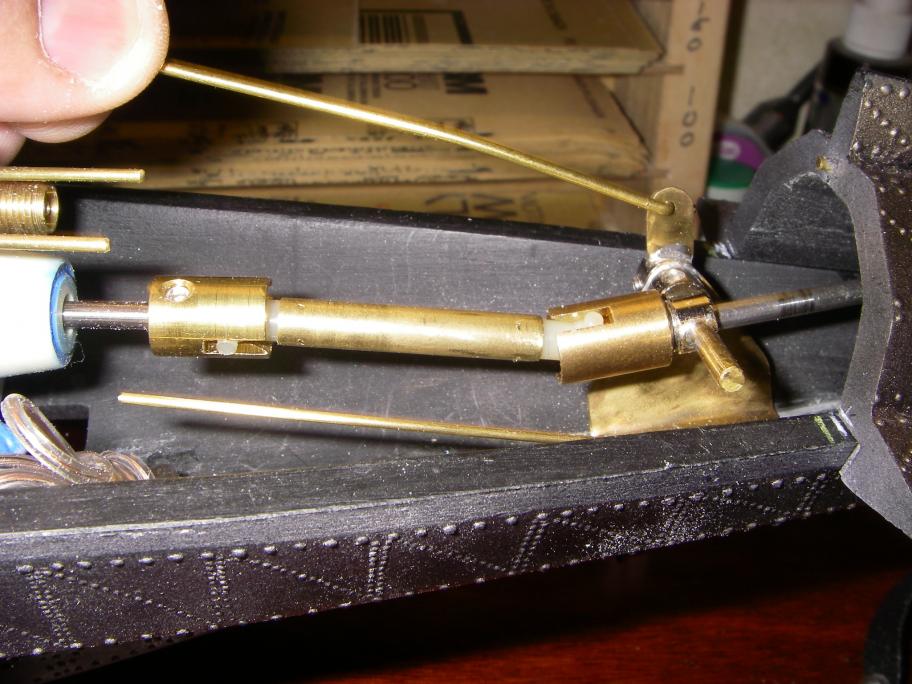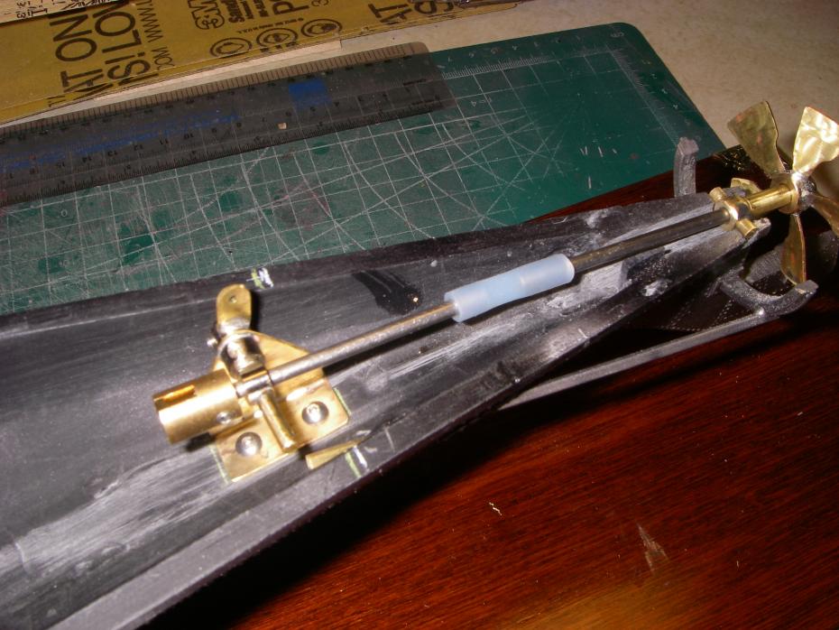 I had two short pieces of 1/8" stainless shaft. In the pictures I posted earlier, the longer of the two shafts is attached to the prop. The prop does clear the fins in full tilt. I do have enough space between the rudder and prop. The prop is almost centered between the rudder and the hull. I have since swapped the two stainless shafts around, the prop is attached to the shorter piece, and the Dumas u-joint to the longer piece. This gives me a little more pitch angle at the prop.