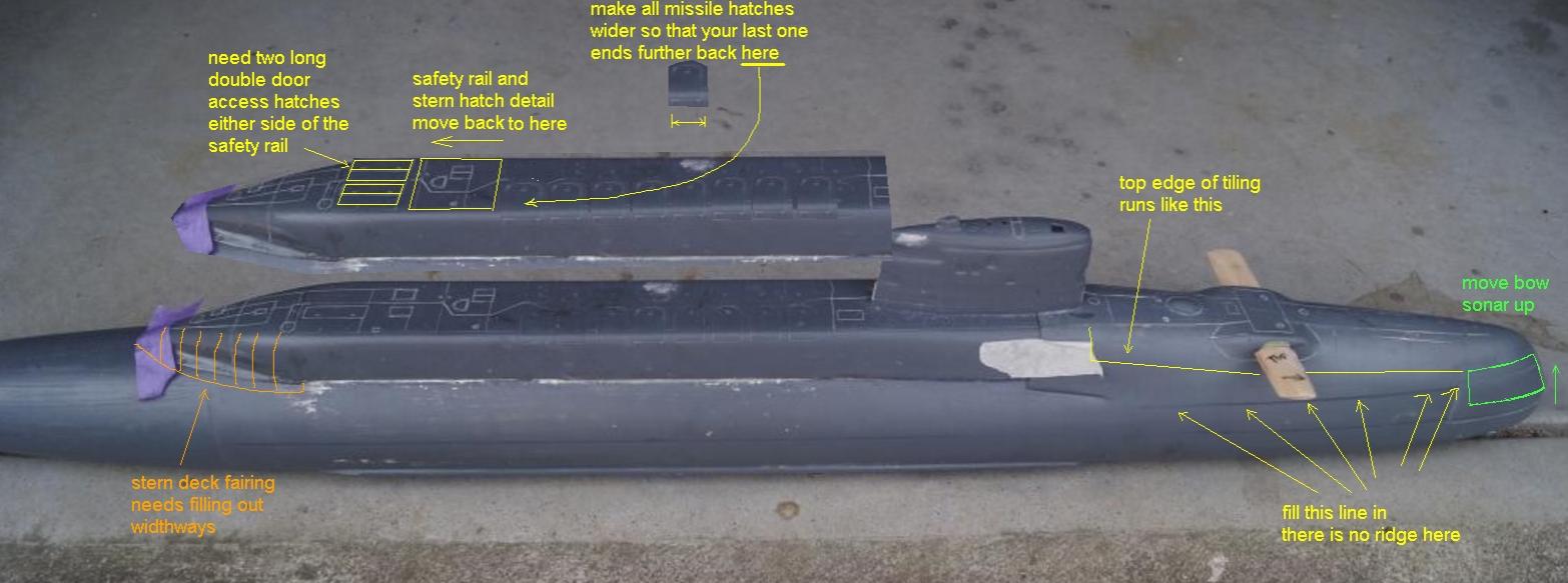 Hi Dave, I spent some time looking over your hull. As I mentioned before you are very close with your detail. The main issue as far as I can make out is that your missile hatches end too soon, they need to end further back. In order for this to happen you will need to widen your missile hatches so that they take up more deck. Problem is you also need to try to maintain the missile hatch length to width ratio. Which leads me to suspect that your missile deck maybe is narrow. Jecobin plans also suffer from missile deck being too narrow. Still, you might get away with it by widening your hatches. Try drawing it out roughly on your deck. I have also taken the time to outline other areas of adjustment which would make your model more accurate. These are only my opinions though. Having no plans and just going by photos is always going to be subjective.