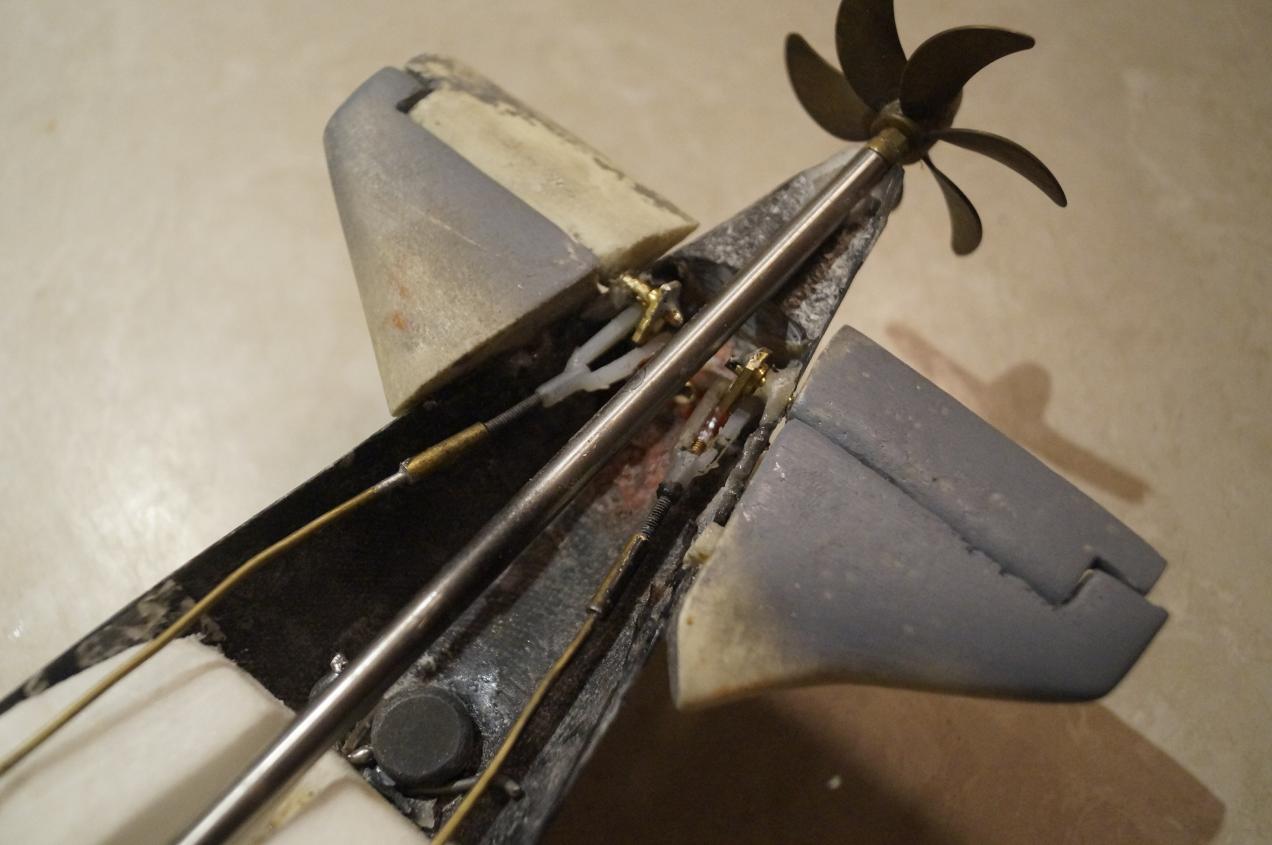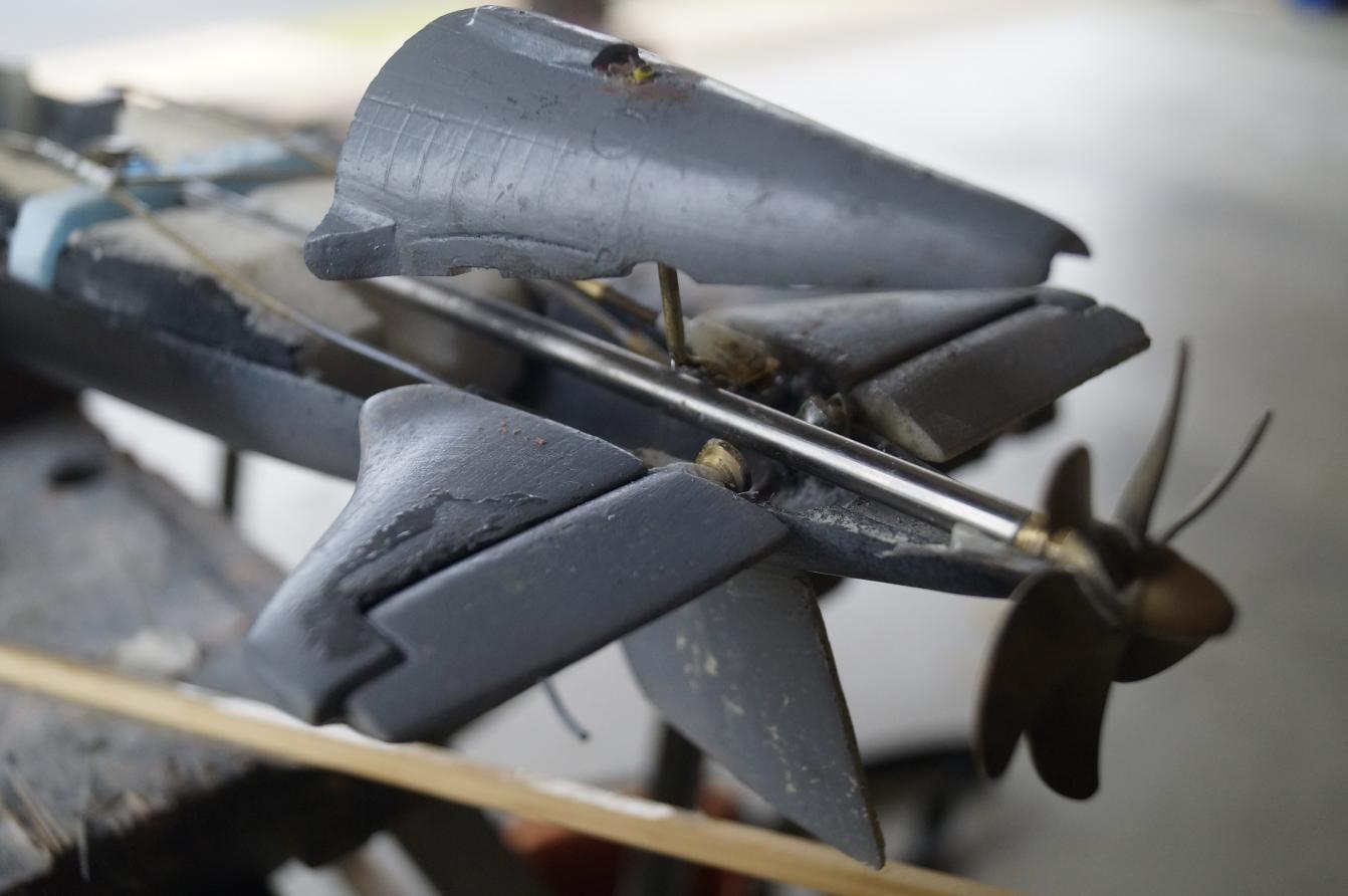The vertical rudders were simply joined onto a brass rod that is simply bend to go around the propeller shaft. I then soldered a small brass plate that will be where the clevice fits to go to the rudder servo. I have spent a fair bit of time fine tuning and getting the movement to be free and un encumbered. This also included making sure that the top rear hull that slides over the top of the top rudder pivot sits neat and doesn't bind with anything. Once this is nice and free I can then look at fixing the lower and upper rudders.