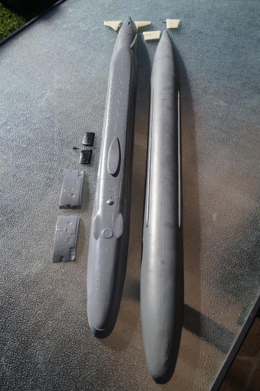 These photos show the final assembly of all the recreated parts. I am using the bottom of the old hull as it's perfectly good. I've binned the old top hull as it was soo incorrect. way too high as you observed and the missile deck not wide enough. I'm then rebuilding the boat in the same way as before with the bow lower section attached to the upper hull and the stern upper hull attached to the lower hull. I will start work on the rear controls and then details like the transducer, forward planes and sail and masts.
