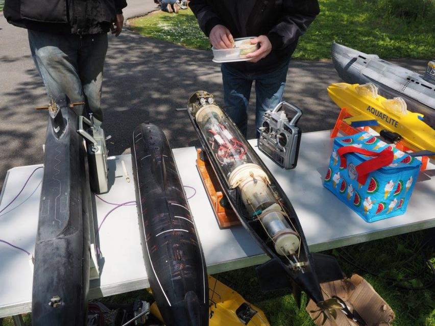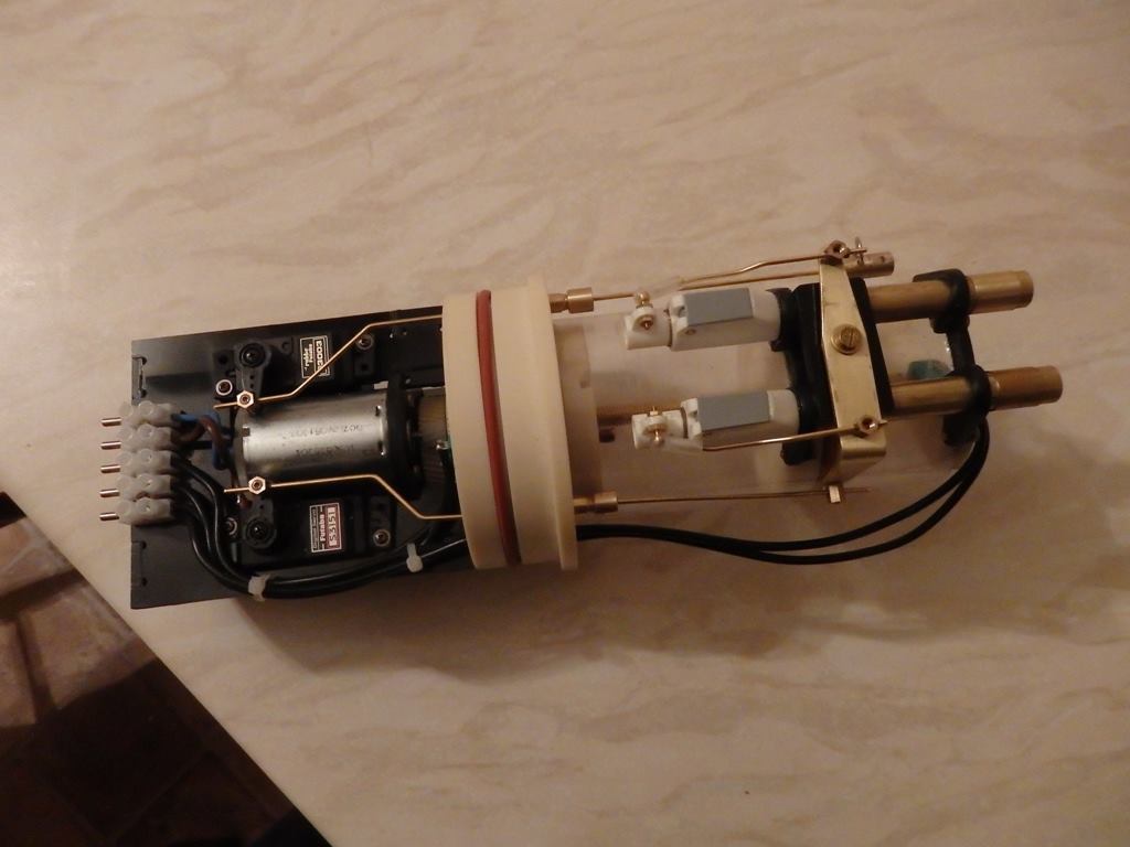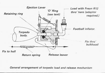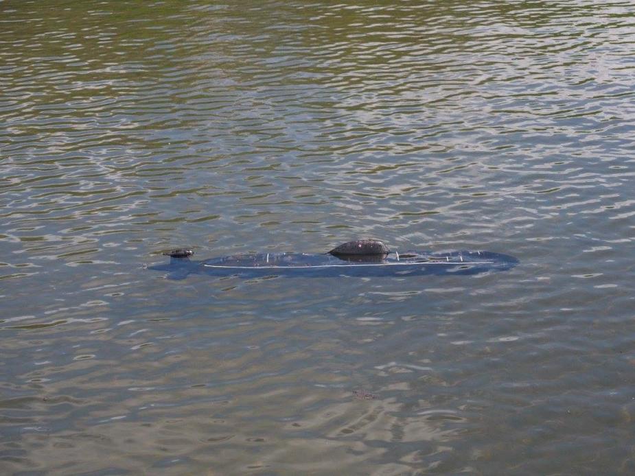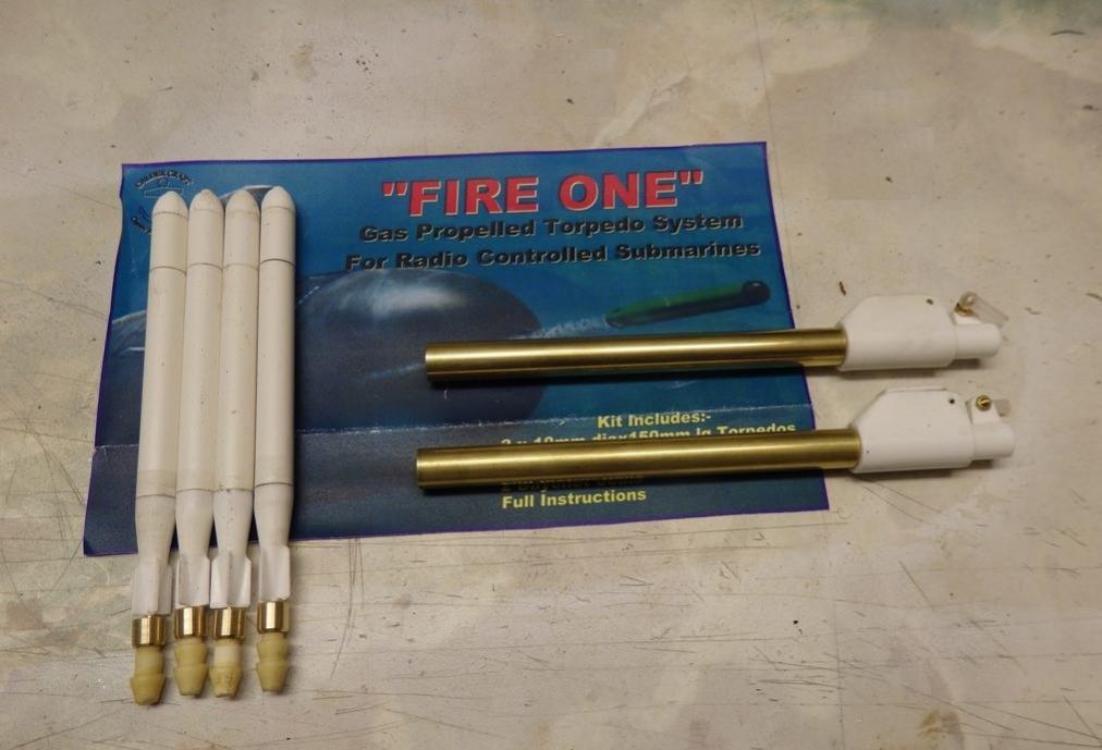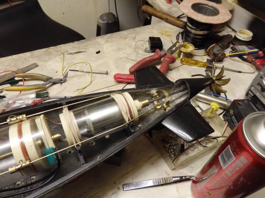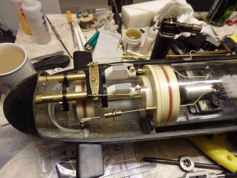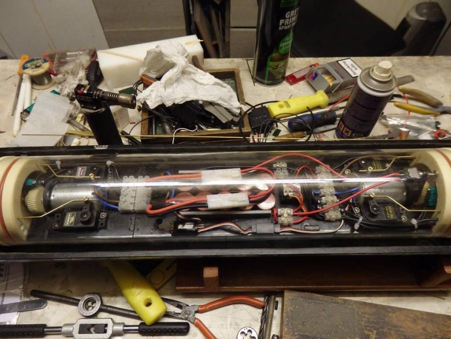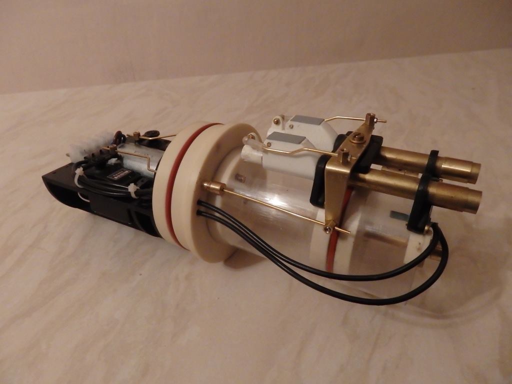She now has a custom designed and built twin piston tank module, MicroGyros auto leveller, Mtroniks esc, a rock crawler motor, working deck and navigation lights, and a very special set of working torpedoes...Ron had to redesign his usual system to be able to install them into the very confined bow space.