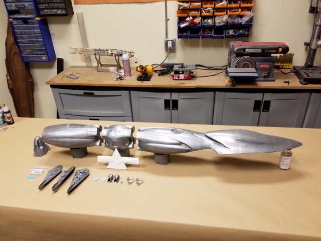 Some of you may recall the 50" version that I started a while back. Having learned from that first attempt, I re-engineered the prints and added detail, adjust the scale to 1:300. That original master pattern was actually sold to a father/son team calling themselves Rapidnadion and they're having a go at converting it to R/C. It looks like their efforts may have somewhat stalled, but I haven't heard from them in a while. They have a channel on Youtube that you can check out if you want to see their preliminary efforts.