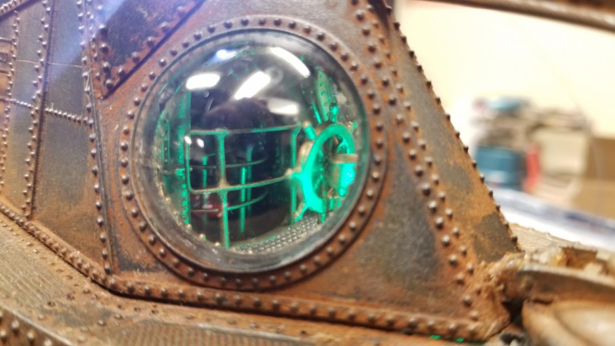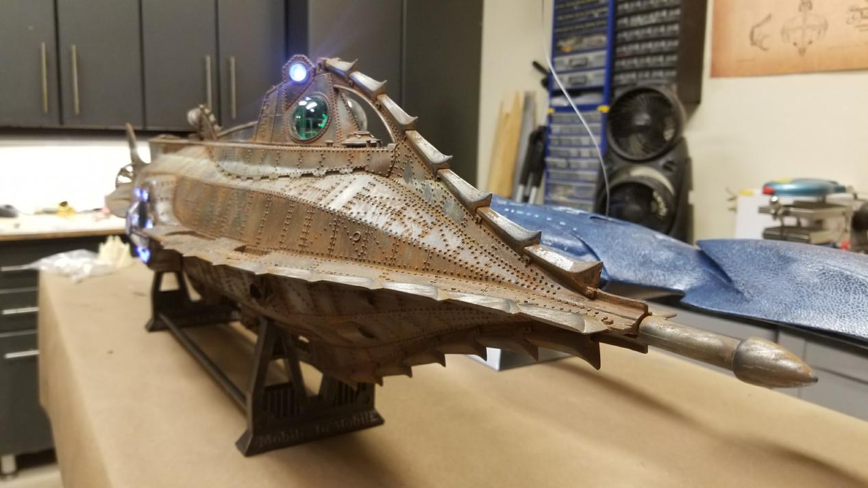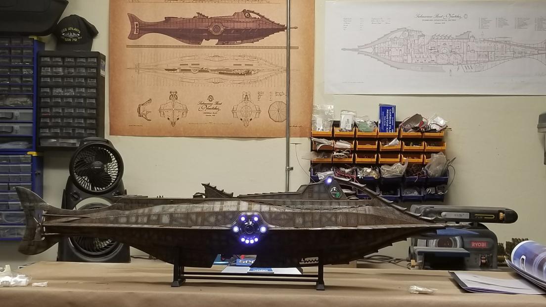 My initial setup using a SWM 3" cylinder turned out to be a bit of a mis-step, as the stock motor was not up to the task of propelling the Nautilus. Her maiden voyage saw that little motor struggling to push it along and smokin' hot at the end of the run. A quick retrofit with a beautiful 12V Pittman motor as well as a swap out for a more efficient prop saw the Nautilus at full ramming speed to make Nemo himself proud. Pitch control is achieved via my standard tilting propeller arrangement and it works exceptionally well.