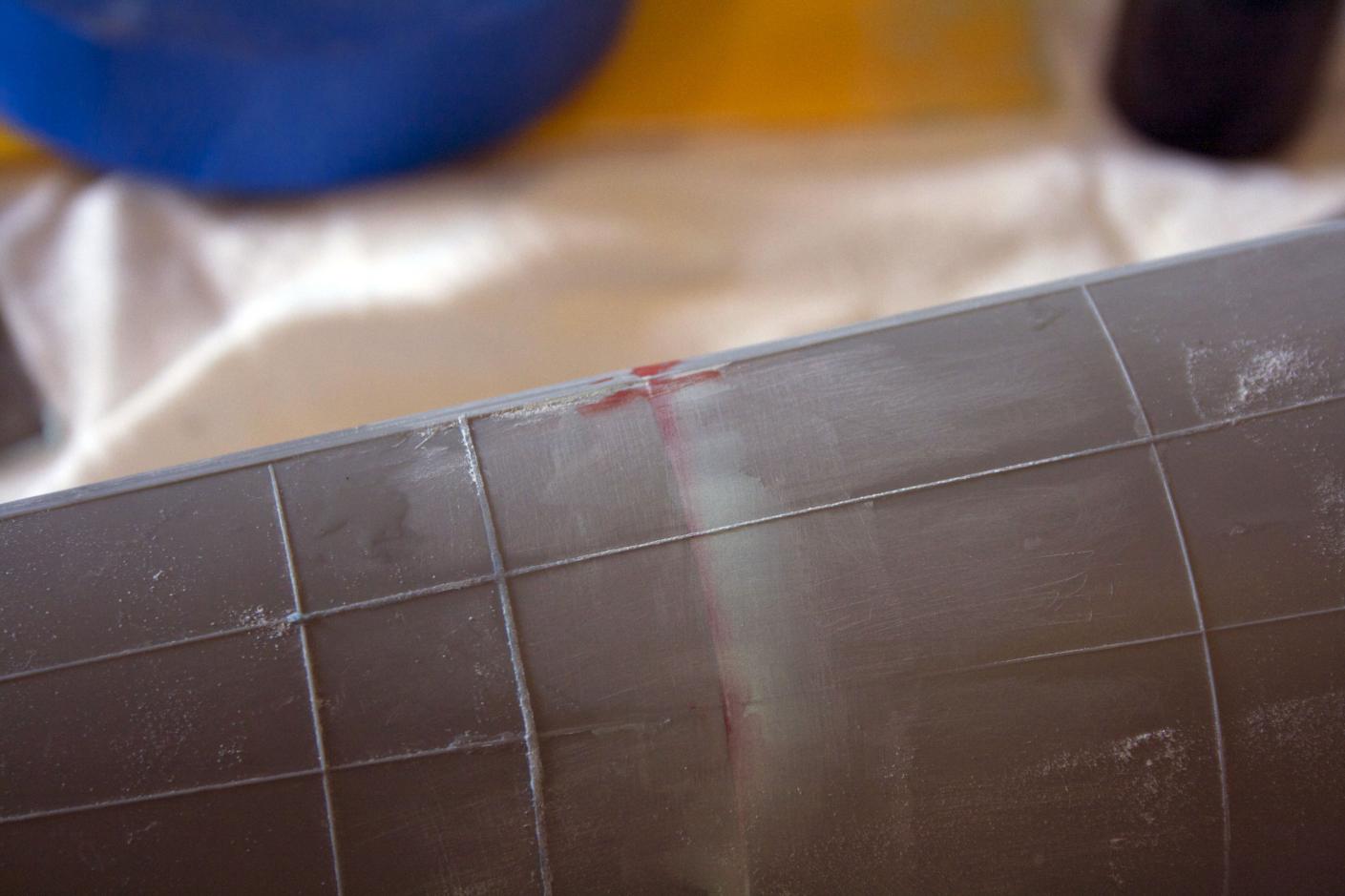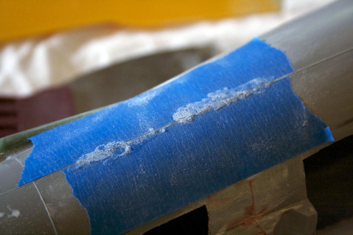 Using 120 grit wet/dry sandpaper, began sanding the along the newly created seam. The goal is to knock down any high areas and use the tape as a depth guide.