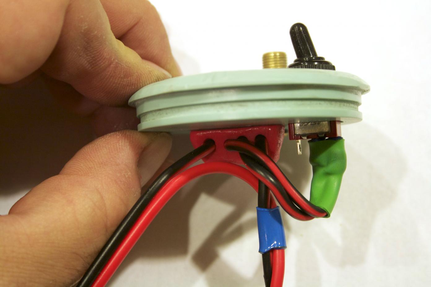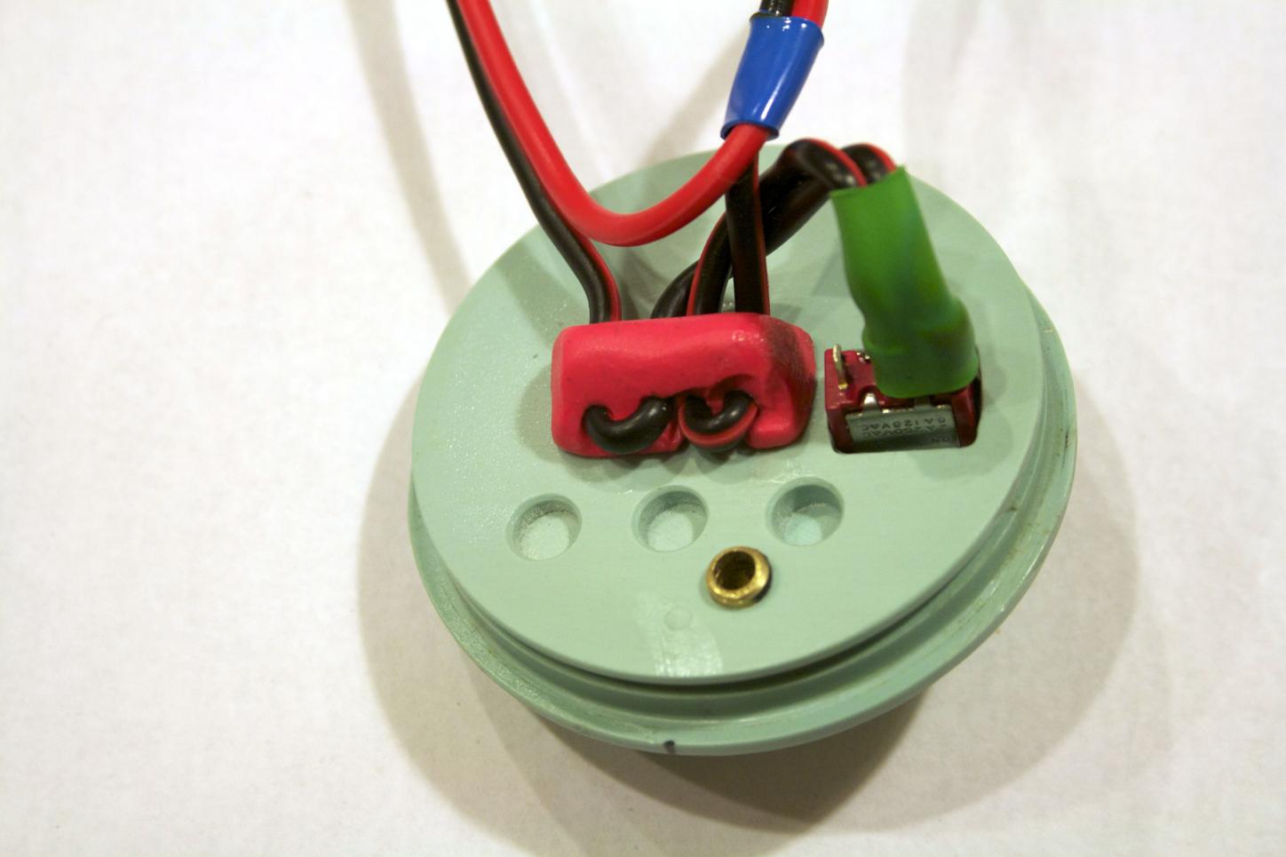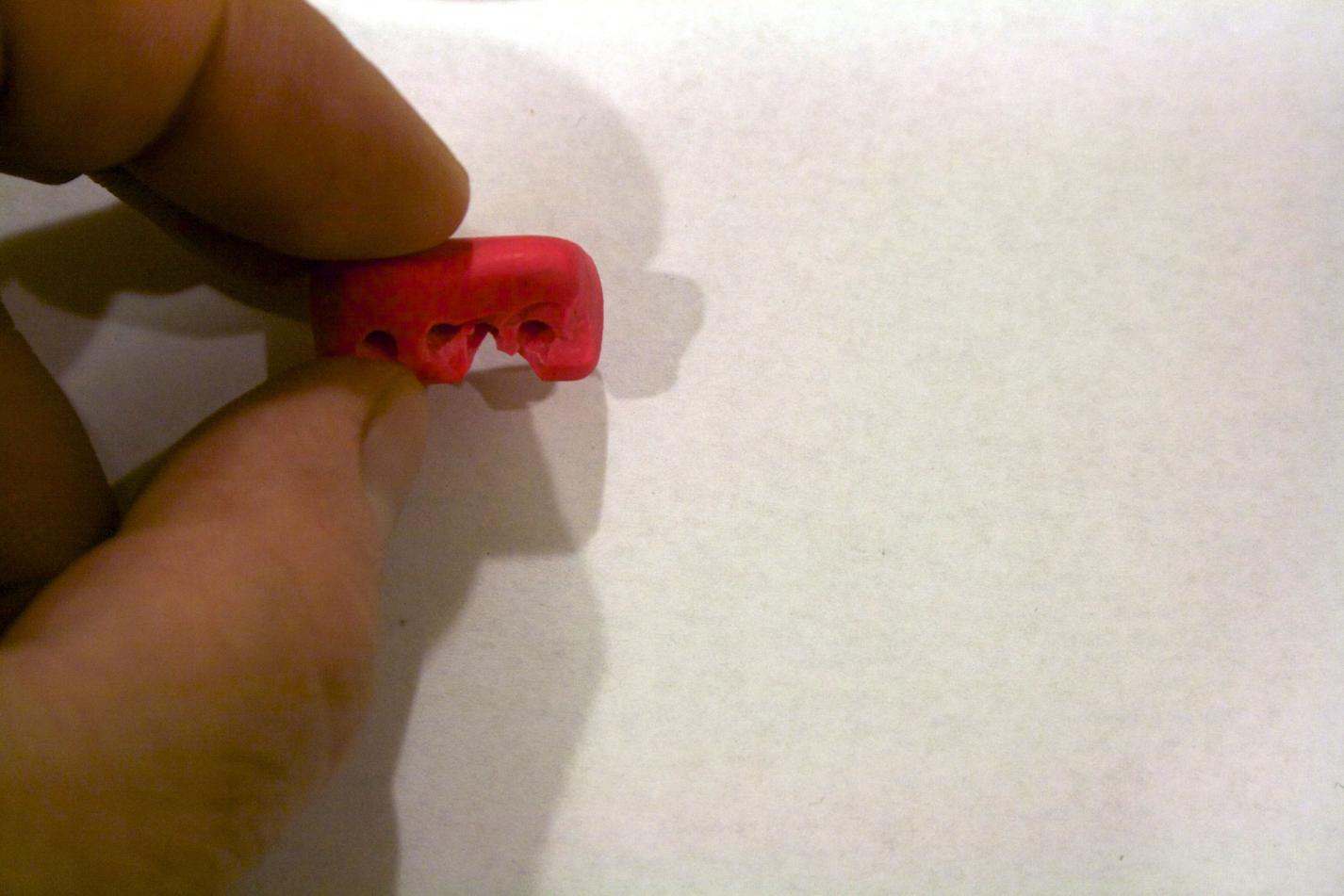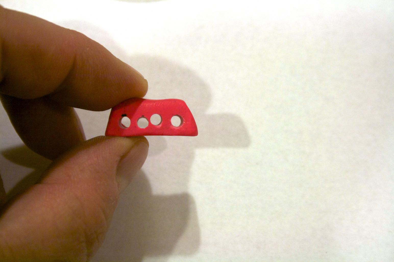 A wire strain relief. I did not have mine, so I made one with Sculpy clay. In this case I made it a triangular shaped rectangle (looks like a long tent).