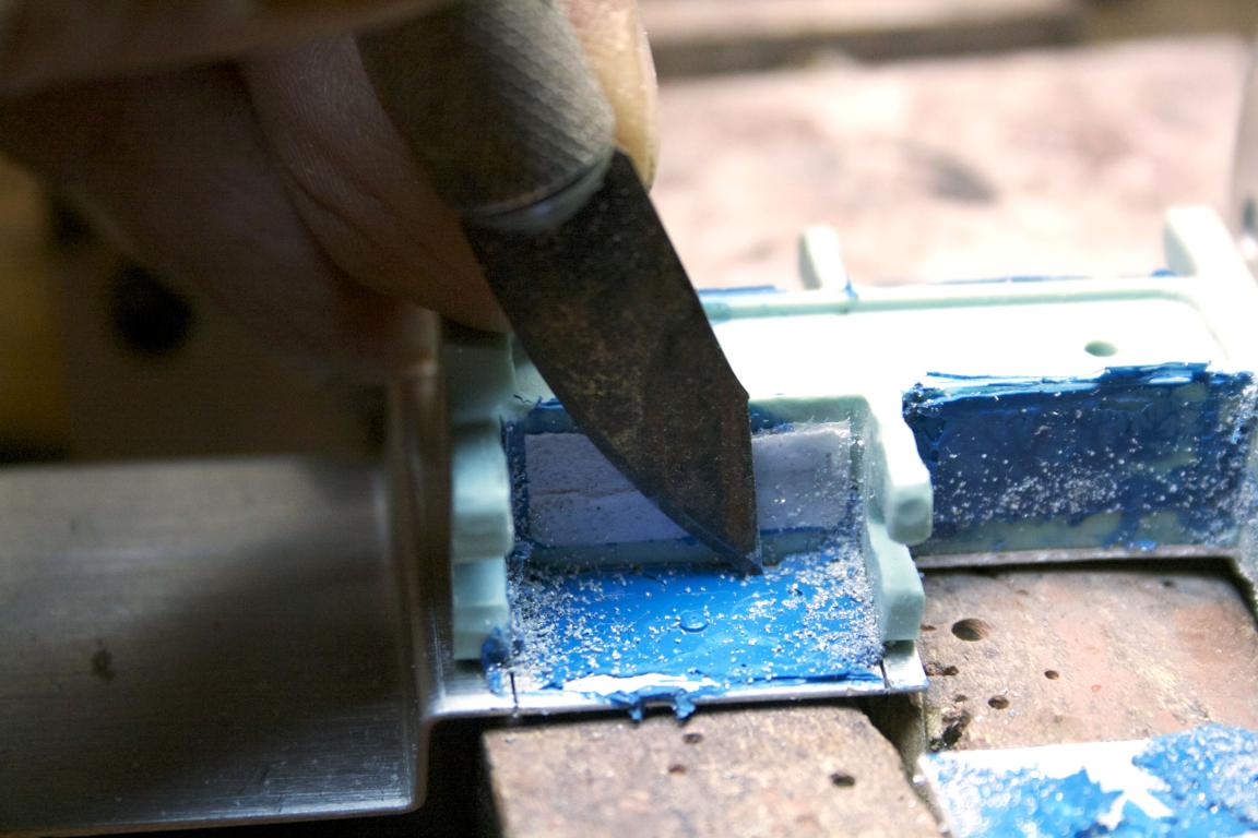 Off to the bench to cut and remove the bottom pieces. I used my jewelers saw to cut on each side of the bottom aluminum plate. Then scored between my two cut lines and bent the metal until it snapped off.