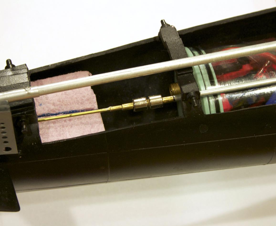 The kit supplies the brackets to hold the torque tube. This tube goes from the aft end of the tube to the bow dive planes. It is made to rotate causing the gear in the bow to deploy the dive planes and recall the planes. The tube had me stumped because the aluminum tube recommended diameter is the same as the Dumas connector. Then David shared one of his pictures and it showed using 1/8” aluminum tube as a sleeve over the tube and Dumas connector. Brilliant and simple. It is similar to the way the propellor shafts were made using a rod as a pin.
