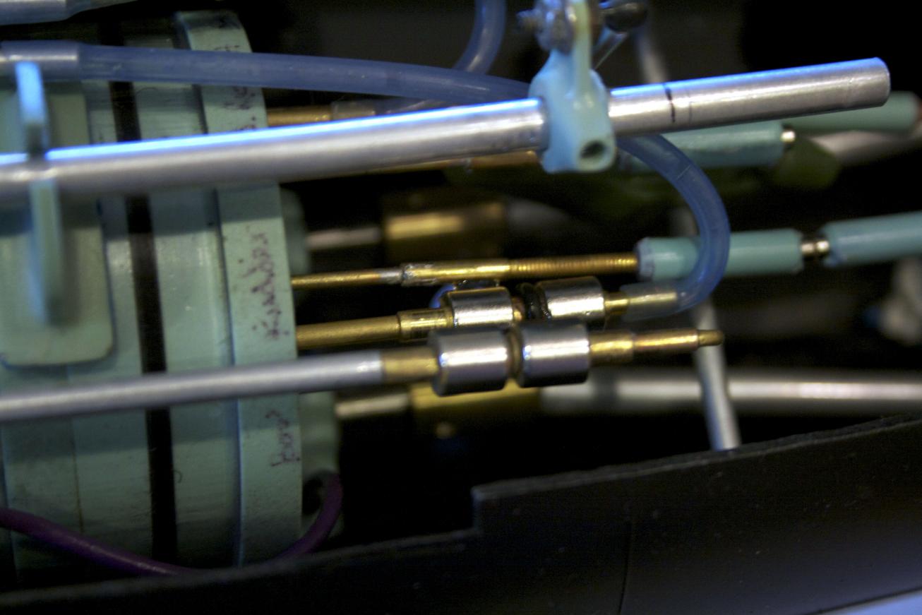 The forward most servos have the pushrod coming in from the bottom and the aft two have the pushrod coming in from the top. This creates a clearance if the pushrods should cross. The new pushrod in pushrod bearing (Marked D. or Stern Plane) was tight again. I am sure that the brass rod has a variance to it, a little variance and it gets super tight. I sanded with 1200 grit paper. Chucking up the brass rod into the bit, I turned the rod at a slow speed and moved the sand paper up and down to try to keep it even. Then applied a lot of silicon oil to the rod and worked it through the bearing and moved through its paces seeing if it would get better. It did get better.