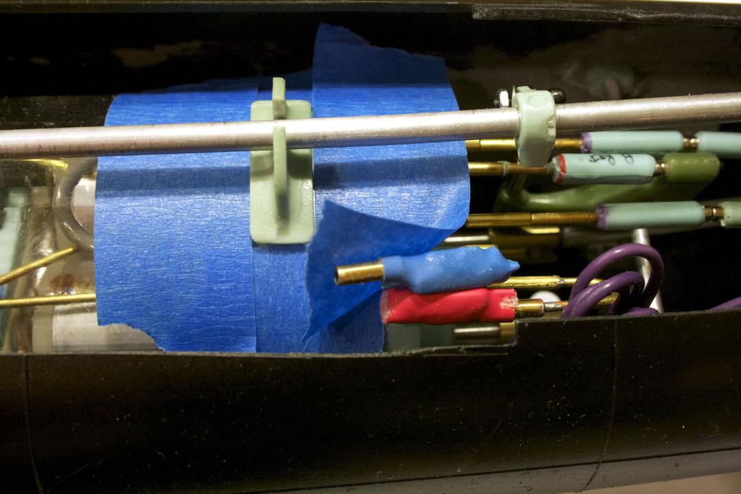 Place sandpaper (rough side up) on the tube and slide the torque tube bearing back and forth to true up the curve of the bearing to match your tube diameter. Then find the locations of were the bearings go. With the torque tube installed to the plane retract in the bow, I began by placing the bearing closest to the aft end and then slid the other bearing until it made contact with the tube. I taped around the bearing to prepare for roughing up the location for affixing.