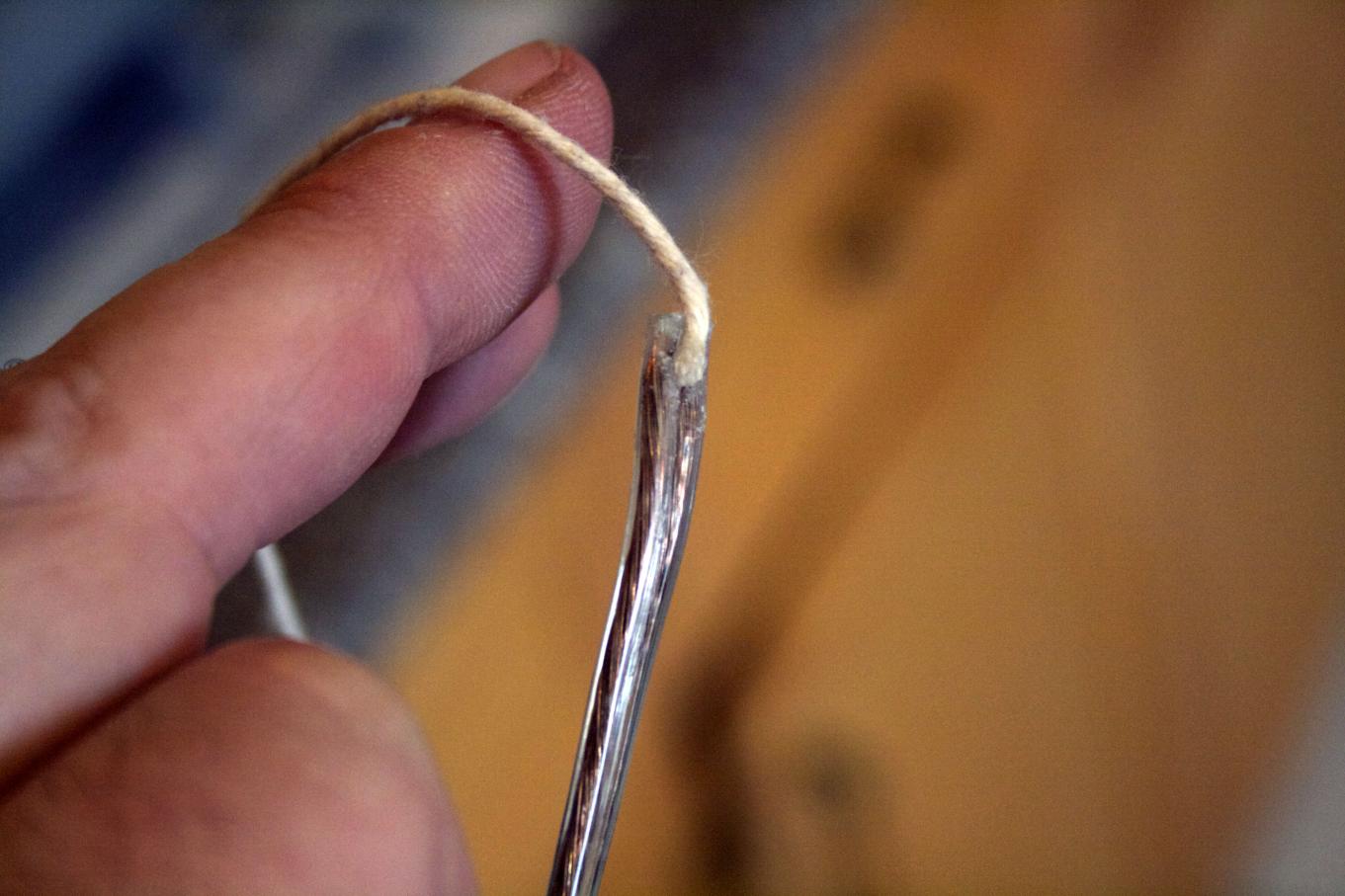 It was Thanksgiving and my wife left the string out for tying up the turkey. I took that opportunity to snag a length of it. I tried to tie the string to the wire and pull it through, but that would not work. So I CA'd the string to the wire to keep the diameter as small as possible.
