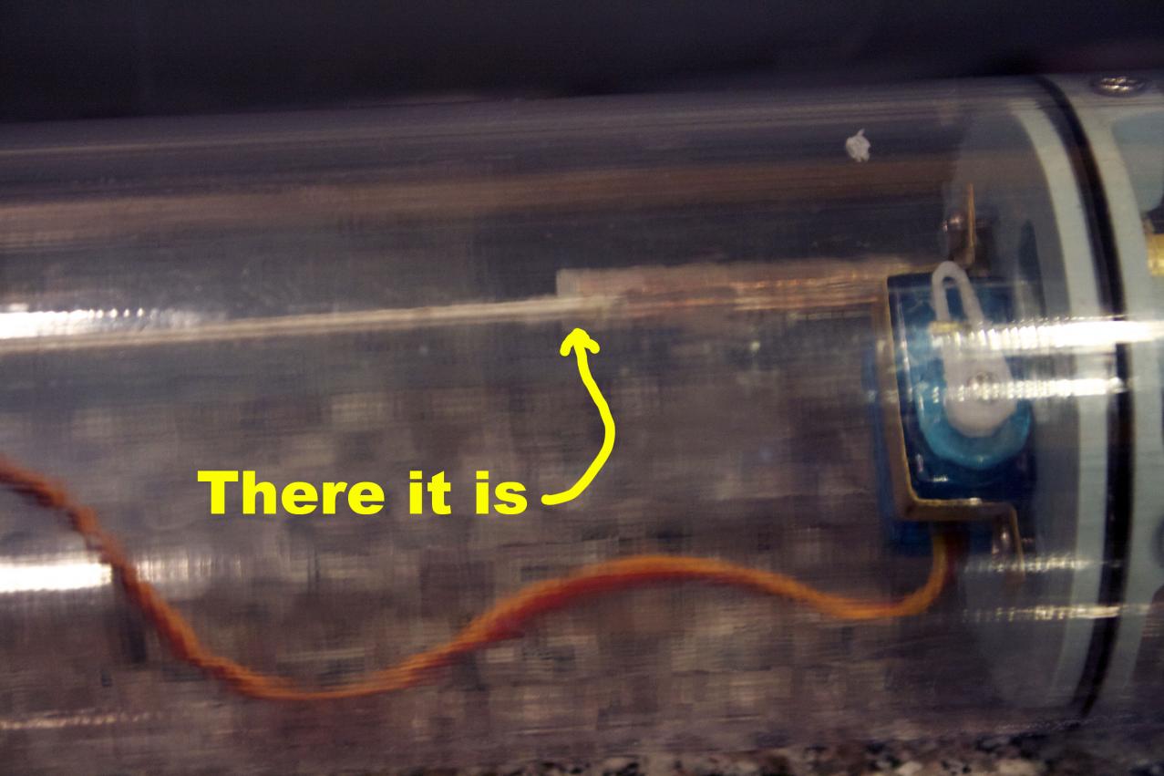 I could cut the bottom out and move the servos down allowing the widening curve of the tube give room for the arm. This is a better choice, but I want to have a SNORT system in place it goes below the servo deck.