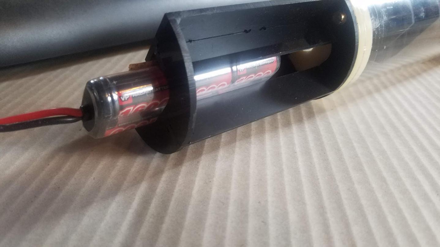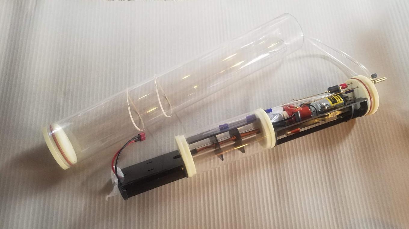 First impression is that it looks pretty awesome. I especially like that the entire unit is basically a tray that slides into an outer WTC. The forward tray also has a nice set up to drop in the battery. This is an 80 mm diameter unit that is normally 540 mm long, but to fit in my Permit Ron shortened it to 500 mm. I did a test fit and its pretty much spot on. It came with 2 servos, drive motor, pump, battery, and magnetic linkage connectors. I will need to figure out how to power and control the pump, as well as where to place the ESC and receiver.
