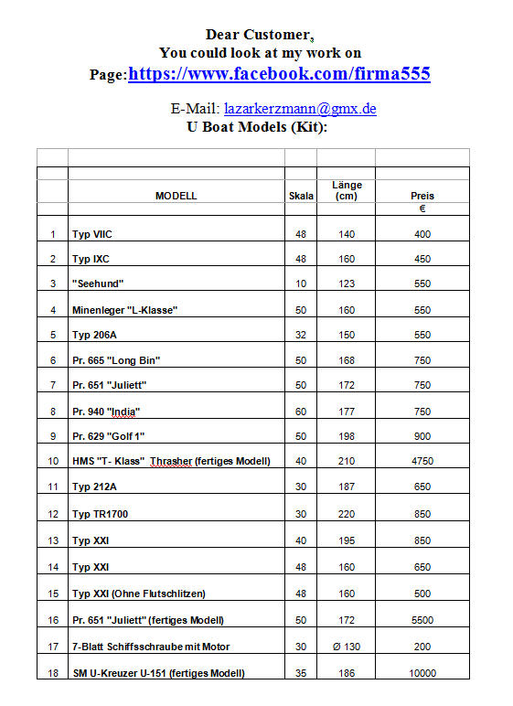 sold a set for the manufacture of a model submarine type XXI in scale 1:48