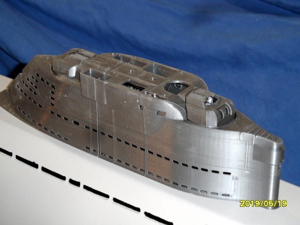 The hull of the boat is made of fiberglass. The rear stabilizers are glued into the hull. Holes (Ø 8mm) for stern tube are drilled. The flood slots are milled and the lower flood slots are closed from the inside with a layer of glass cloth. If necessary, these lower flood slots can be easily cut with a scalpel.