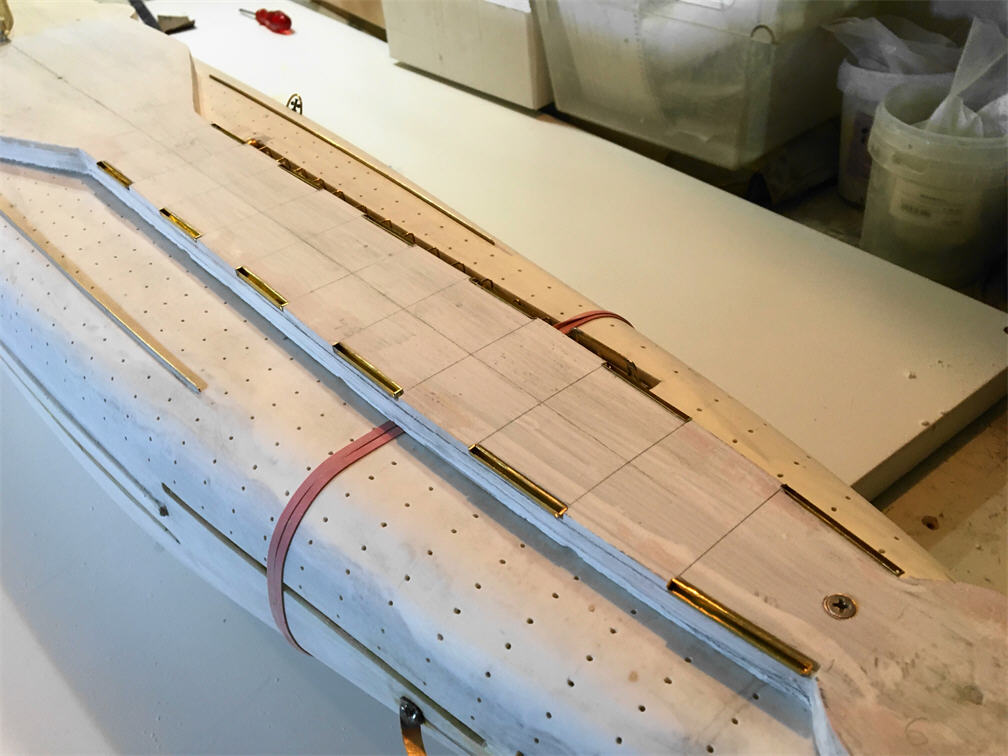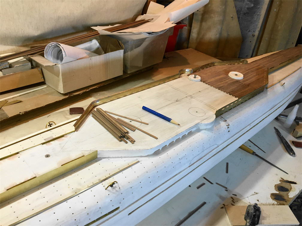 I got some details for the boat and continued to work. I installed the bulwarks (unfortunately not all) and began to lay the deck flooring. After examining many of the available photos, we determined for ourselves the dimensions of the deck board. Length -3.5 m, width - 14 cm.