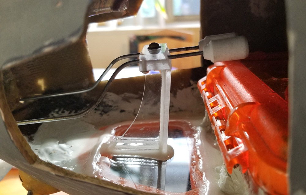 Also, if you look to the lower right of the image, you'll see a round opening where the old WTC will go, and a threaded post with an orange squishy on top. This is part of a pair of bolts that will hold down the assembly for filling/draining the ballast tank. The assembly will be mounted, modular as always, to a CF/epoxy plate with the brass bellcrank.