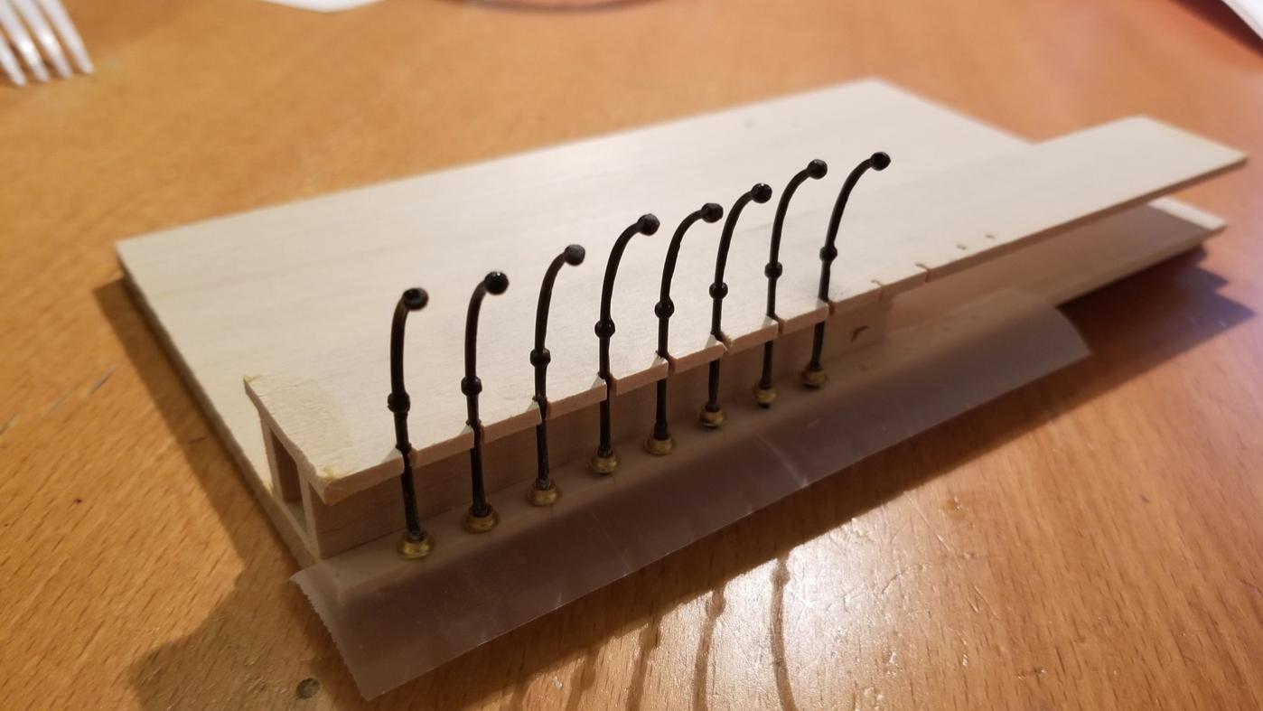 This is a frame I built to adjust each stanchion's height perfectly before epoxying little base pieces to them all. Detailing has to take a back seat to more critical jobs, but I wanted to get this miserable task out of the way as cleanly as possible.