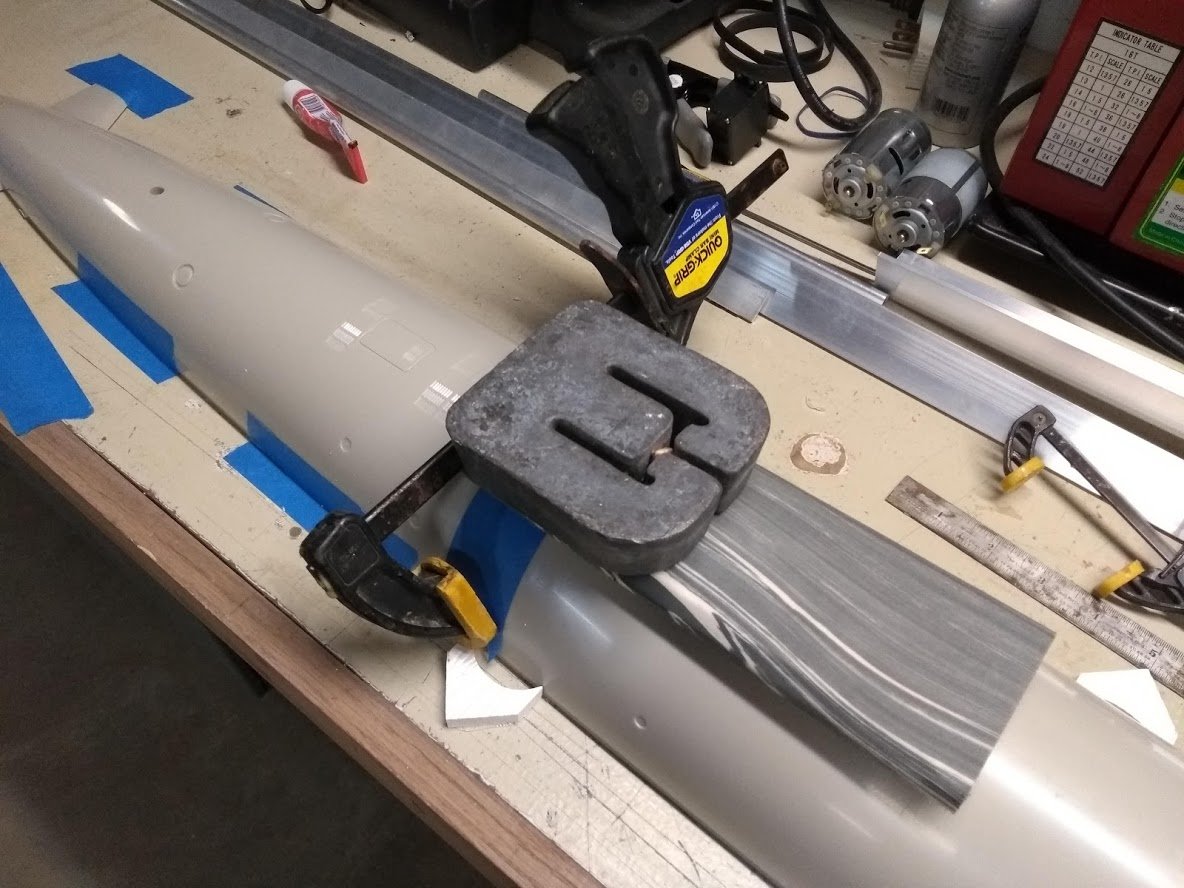 The aft section is taped to the bench to hold it in position for the glue-up.