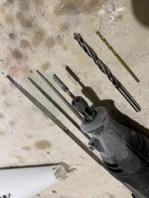 In this first photo you can see the small holes in the corners, two vents with the larger bit, one ground out to the edges, and the last step of filing to the final opening.