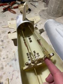 I want to try setting up the outer planes more like airplane ailerons as opposed to working to aid the stern planes because I have a lot of trouble getting my previous version of this Seawolf model to turn a halfway decent radius. My old model literally had a 15’ turning radius. So I’m wanting to see if having the outer planes rotate the hill when turning will help the radius be smaller. So this is hooked up so the outer planes move in connection with the rudder instead of the stern planes. As the rudder moves one way, the planes rotate in opposite directions to roll the boat into the turn. When the rudder goes the other way, so do the outer planes.