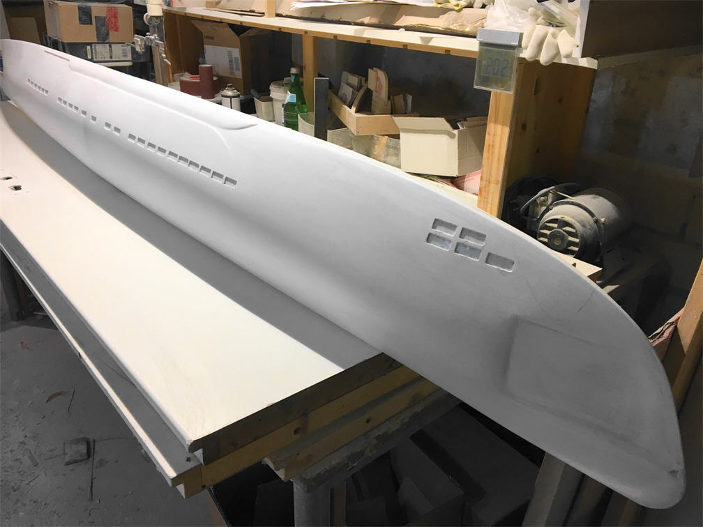 Continued work on the project of the boat type XXI. All four parts of the body were processed and all irregularities were eliminated with the help of 2K filler. Now I install the imitation of the lower scuppers on the dummy in order to print the places of their installation on the matrix. (Top and other small scuppers will be milled on the model itself).
