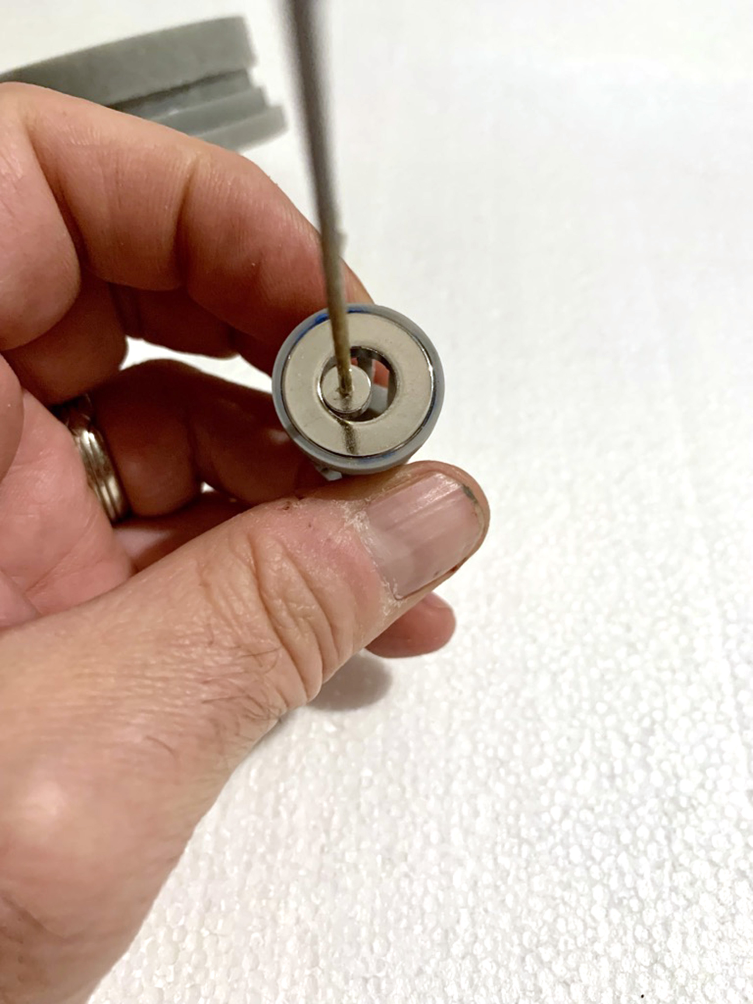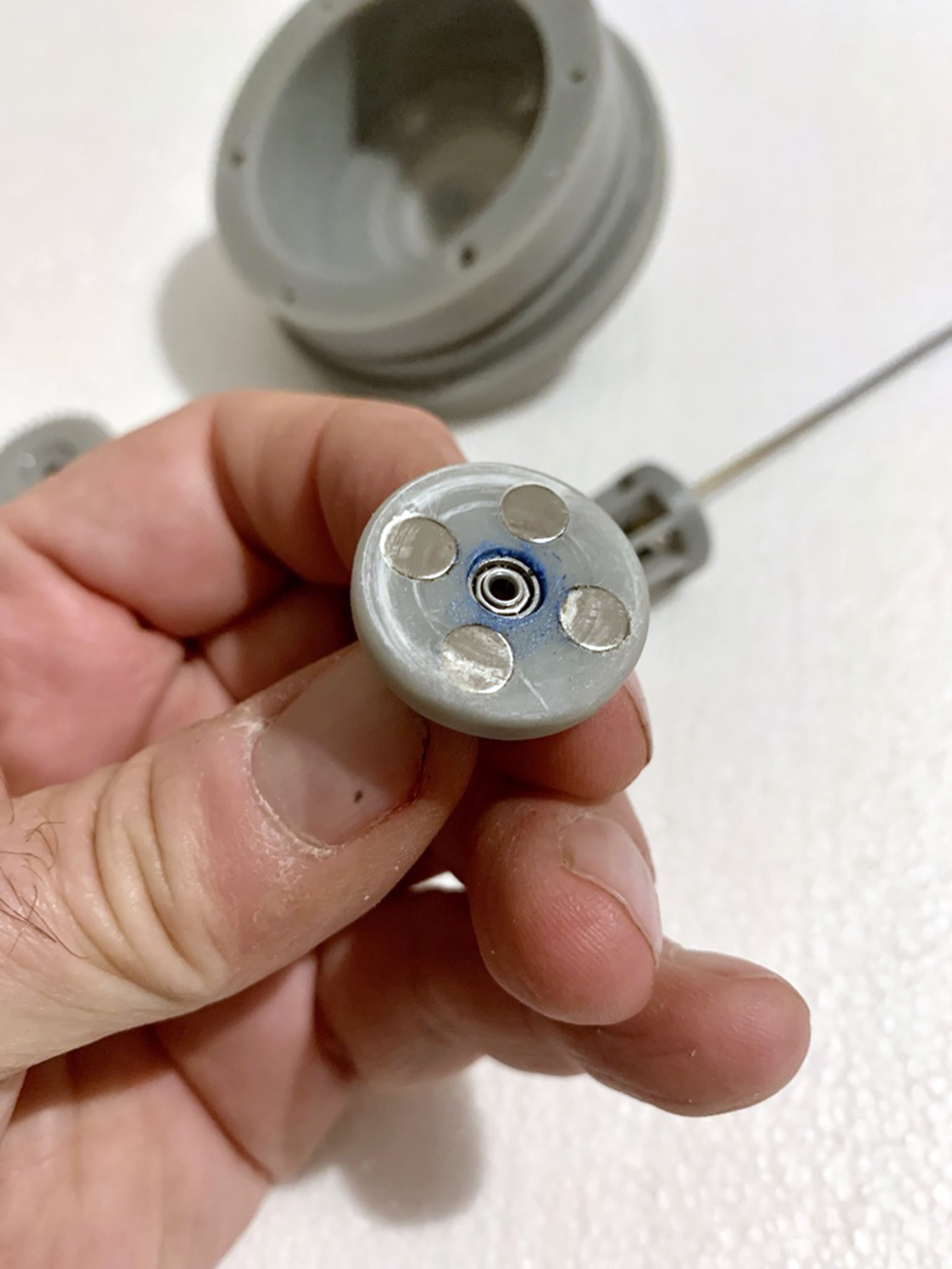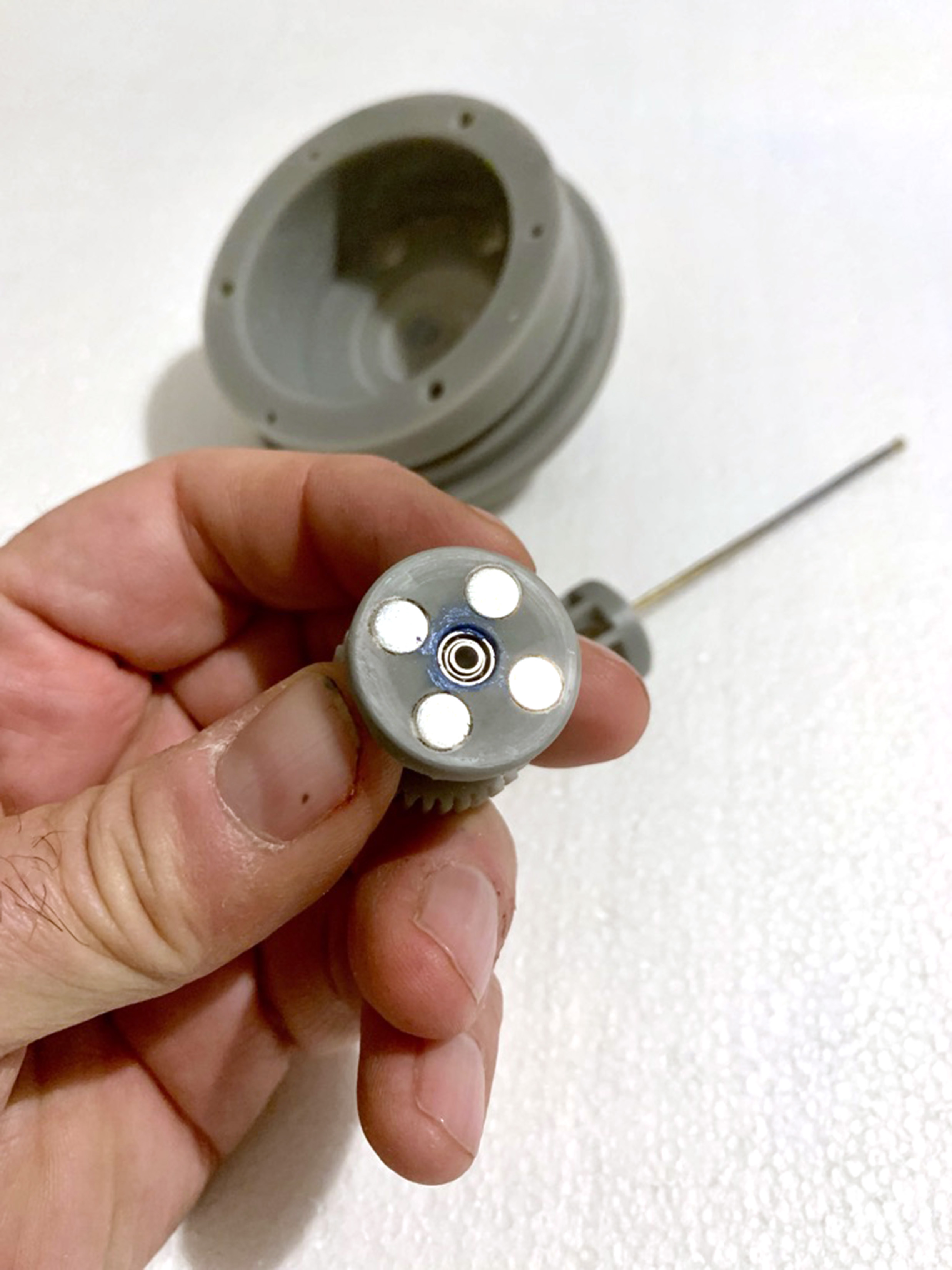 Here is the 3.5” prototype, In the center is the geared magnetic drive. The rod coming out of the hole is attached to a cylinder magnet.