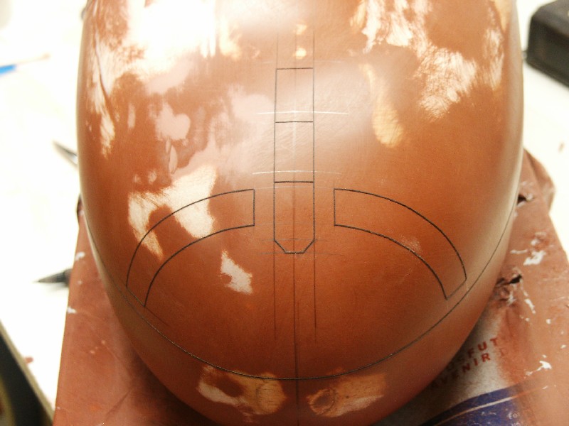 Once the panel line locations have been marked, very thin (1/64" wide) tape is applied along where the panel line should be. This will initially create a raised panel line. Once I have all the tape applied, I'll spray on several coats of high-build primer. (In some areas I may also choose to use filling putty) This will all be sanded smooth, and the tape will then be removed leaving a nice, crisp recessed line that can be easily picked up in the molding process.