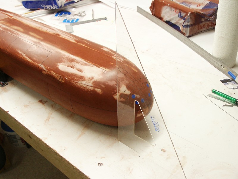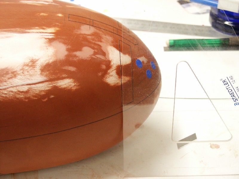 This morning I have some good progress shots to share. I've begun carefully laying down the Chartpak tape that will be used to make the recessed panel lines. This is a fairly tried-and-true method for creating butt-joined type panels in the model jet community. I'll be using this technique to outline only major features such as the doors that cover the cruise missiles, bowplane doors, towed radio buoy, etc... All the flood and limber holes will be marked using the same technique.
