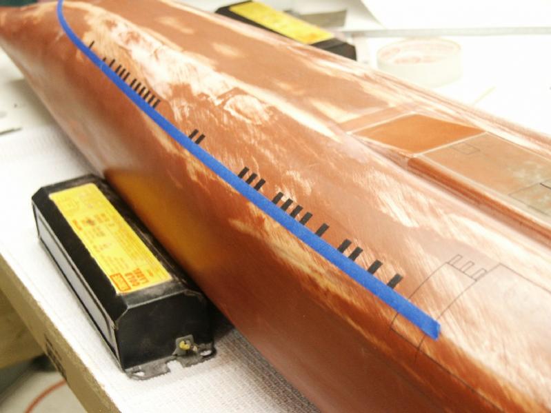 I started with the line of limber holes just under the Granit missile doors. I already have pencil marks on the hull to show where to line everything up but based on photos I've decided they need to be "adjsted" a bit higher. To be sure that all the holes have a perfect vertical alignment, I temporarily layed down a strip of tape to mark the bottom edge of where all the holes should line up.
