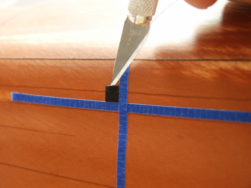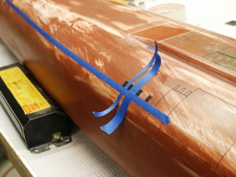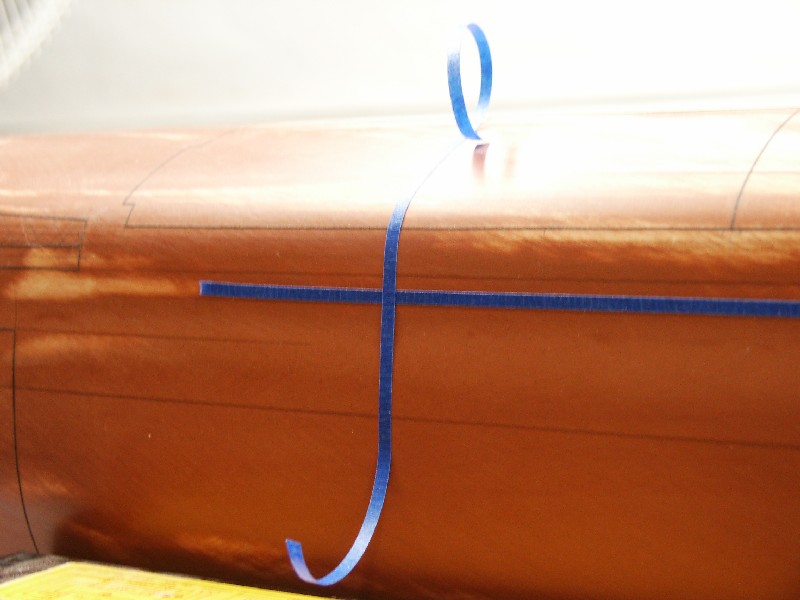 Now in the upper left and right corners I place my square of eletrical tape that marks the location of the flood hole on the hull.