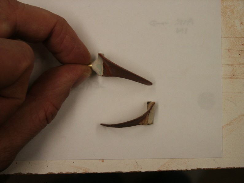 Now on to side two- Using the same technique I made a mating "base" and hot-glued it to a second 'foot tool'. Then, using a piece of brass rod to ensure alignment and hot glue to hold everything together, I glued the real blade blank to the second foot and broke away the first 'foot tool'.