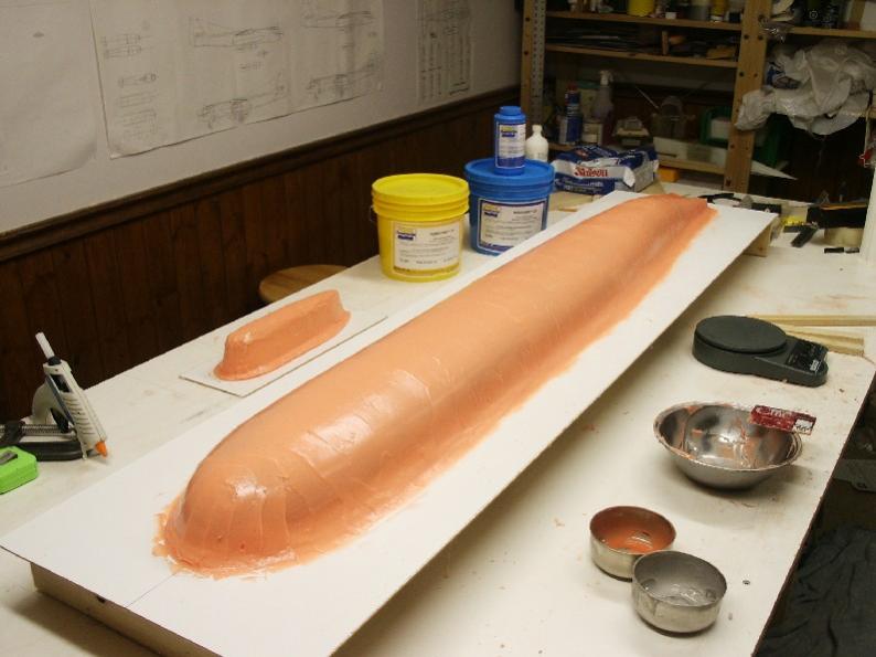 I troweled down coats 3 and 4 onto the hull and sail molds last night. The Rebound 25 in it's natural state, as I used it for the second layer, has a consistency a little thicker than liquid honey. Mixed with just 1% (by weight) of the thixotropic additive, it turns to peanut-butter. No kidding, I couldn't have put this stuff down with a paint brush if I tried! Being as thick as it was, I used an old credit card to smear down coat number 3, and once down on the hull it didn't sag a bit. Four hours later I came back and smeared down coat number 4 using the same process, and here is the result.