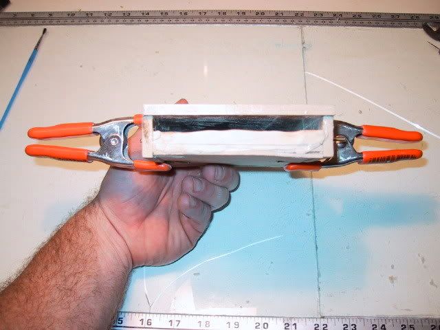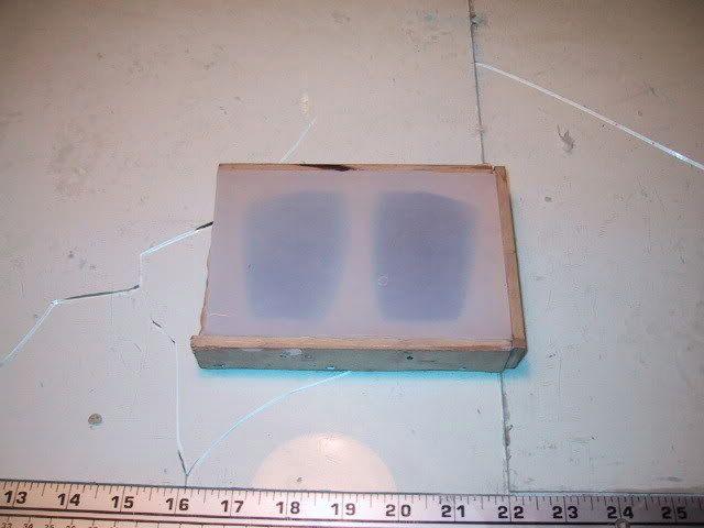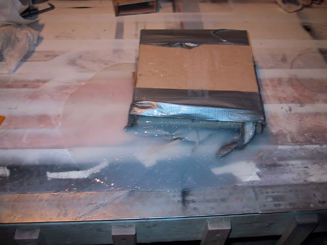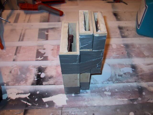 The building of the mold boxes is where I made my first mistake. I failed to realized the importance of quality built boxes, and instead, I kinda' just rushed through this process, quickly throwing the boxes together. This mistake was realized when I began pouring RTV into the mold box...and the box began to leak. There is NOTHING you can do to stop an RTV leak. Once that stuff starts seeping out, ....she's game over. In my failing attempt to stop the leak (you will notice the duct tape), my crap built box fell apart. ....I'll let the picture tell the rest of the story. Another thing I did learn from this is that the best way to clean up RTV is to let it set, and then peel it up. If you try to wipe it up while it's "wet", you have a hell of a mess on your hands.