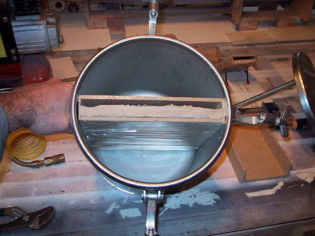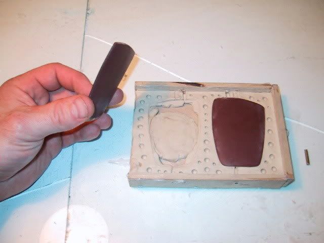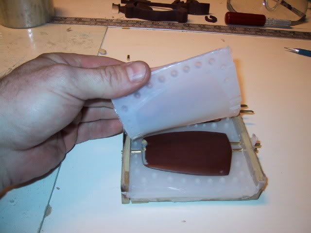 The GI 1000 RTV is then brushed onto the exposed 1/2 of the plug with just a regular paint brush. This stuff captures all the details of the plug and is made of silicone rubber. The GI 1000 has to be continually brushed on to allow it to set up, which can take a while. Since the GI 1000 is a silicone rubber, it will NOT stick to the plug and NO parting agent is required. I'm unsure exactly how thick to build the GI 1000 up. ....around 1" maybe ??, I'm guessing. Keys that will ensure that the GI 1000 and the mother mold are aligned perfectly are required in the GI 1000, although I'm not sure what these keys are made up of.