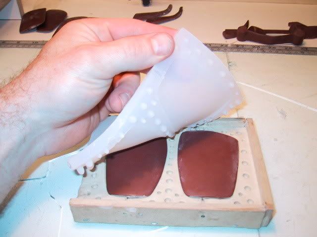 After the 8 hour setting period, the lid is removed. This may take a little prying, but it will peel off nicely once started. The Smooth Sil is slightly transparent so you can see the masters through the rubber. Then, this half of the rubber mold is peeled back and removed. The RTV removes easily without the need for a release agent. With the first half removed, the masters are removed from the clay, and then the clay from the box.