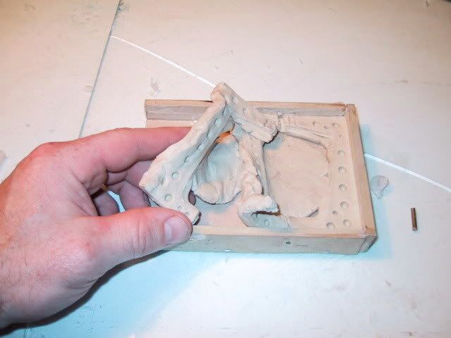 It can be seen that I put some vents out the bottom of the mold. DON'T DO THIS. Make your vents come all the way back up to the top to the same side that you will pour. The vents at the bottom caused me all kinds of grief with the casting material seeping, resulting in a partially casted final part. I had to redo all my molds to have proper vents. In addition to this, make sure you build your mold boxes big enough to allow for proper venting channels. Some may argue the need for venting channels. I feel that when the molds are being constructed, it takes very little extra effort to include the vents. The vents are extra insurance that your final casted part is not going to have air bubbles. You decide if you need that insurance.