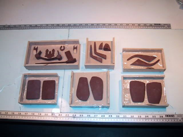 I had quite a few parts that required molding. You will want to group your parts as per the depth of the mold mox you will require. If your mold box isn't deep enough, your final mold will be too thin. I initially tried to shave and cut as many corners as I could to make my mold boxes as small as possible, which would mean the least amount of RTV. This is ANOTHER mistake. The boxes need to be big enough....don't shave TOO many corners or you'll end up just redoing, which doesn't save a whole lot of that very pricey RTV.