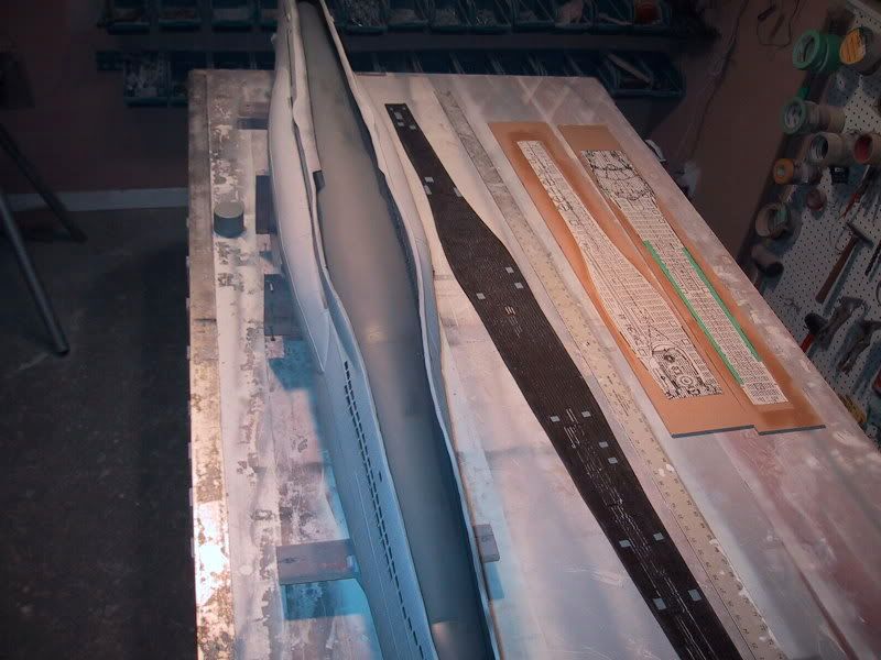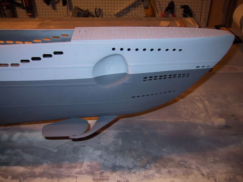 The bow and stern upper deck castings were glued into place. Once dried, some minor sanding was required to flush up the casting with the contour or the hull. Some filler was used to create an invisible transition at the very tip of the bow.