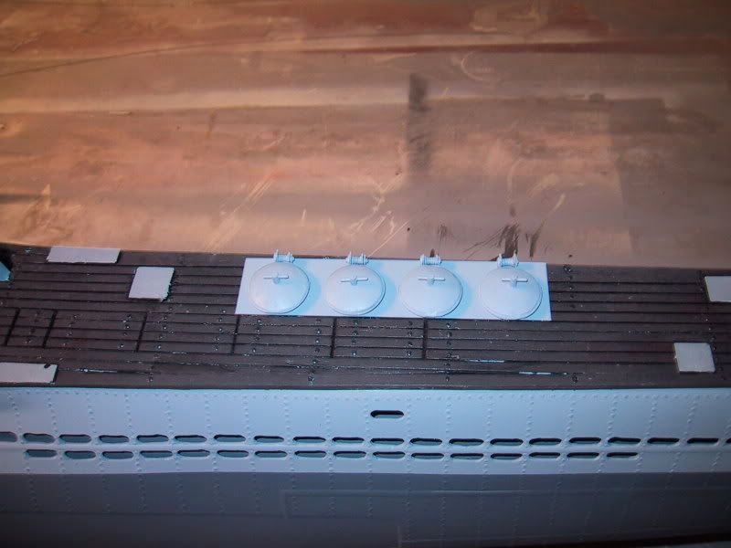 To finish the castings, I first sprayed the entire part with flat black. This was to fill in the gaps between the planks. After that dried, I rolled on a medium brown rust paint, applying very light pressure with the roller, one of those fine sponge rollers, so as to not fill in any of the flat black gaps between the planks. After that dried, I brushed on some pastel chalks just to give the planks a better, more weathered appearance as well as take some of the shine off the brown. Then....I applied two coats of satin finish out of a spray can. Then....the hatch and deck bolt details were painted.