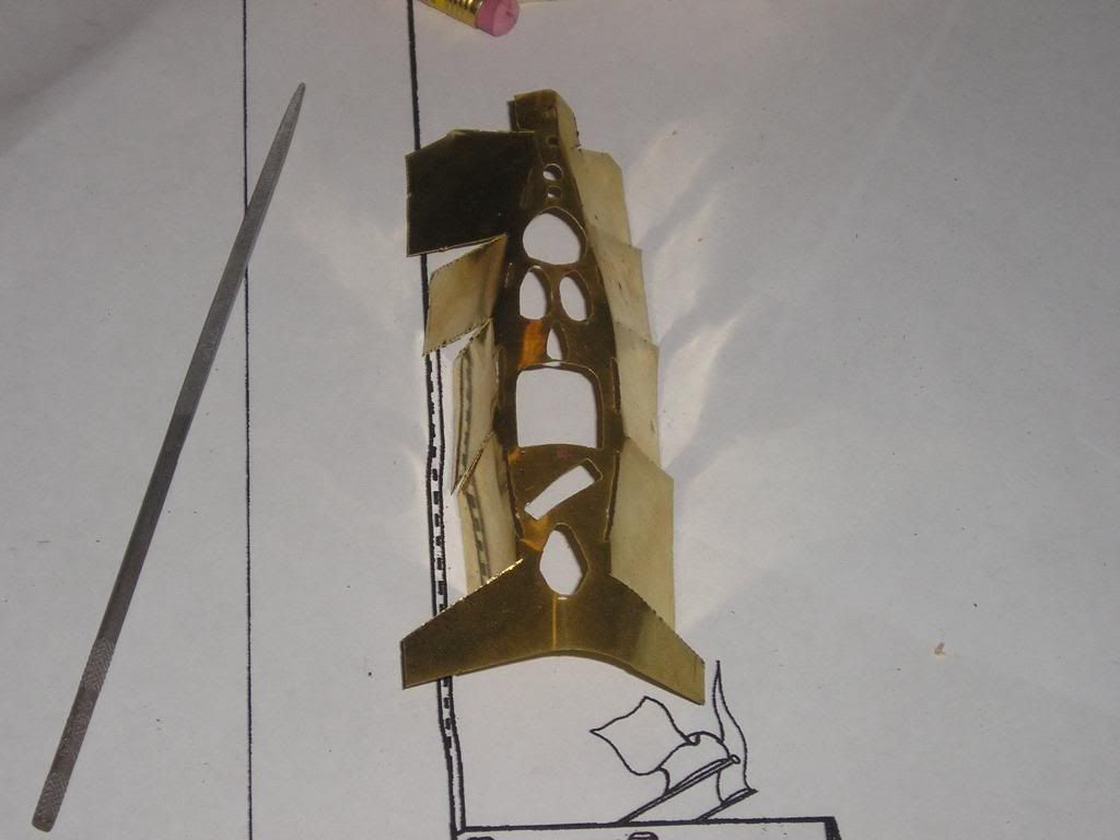 For the detailing on the top of the sail, I am cheating. I copied the plans and made a PE template directly from it. Notice I have made some modification to some of the shapes if you are familiar with the Permits. These are simply to get closer to what the real thing looks like.