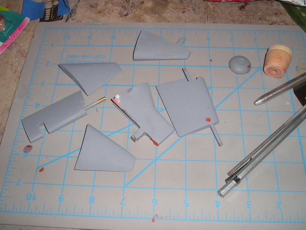 One thing I have done differently on the props compared to past efforts is my technique of applying the fillets at the base of the blades connecting to the hub. The usual process is to glue the blades on and then build up the fillets using automotive filler. This I glued the blades on, but now I add a very small amount of baking soda to the joint, press it in tight with my round file for the shape. I use my #11 Exacto knife to carefully scrape away any excess baking soda.. I have a little pool of thin CA nearby from which I draw a small amount using wire dipped into it, and in this case I use the very rigid music wire. The wire has enough CA on it that when it comes close to the blade root it then wicks into the CA and instantaneously catalyses to the shape I wanted. This also great increased the blade root strength considerably so I put a little more pressure on with out worrying about breaking a blade off, or more importantly from periodic drops to the hard ground or bench. I have no pictures of this process as I only have two hands in which to work with!