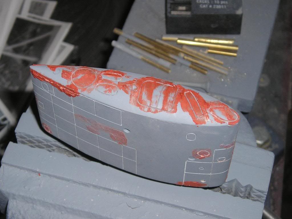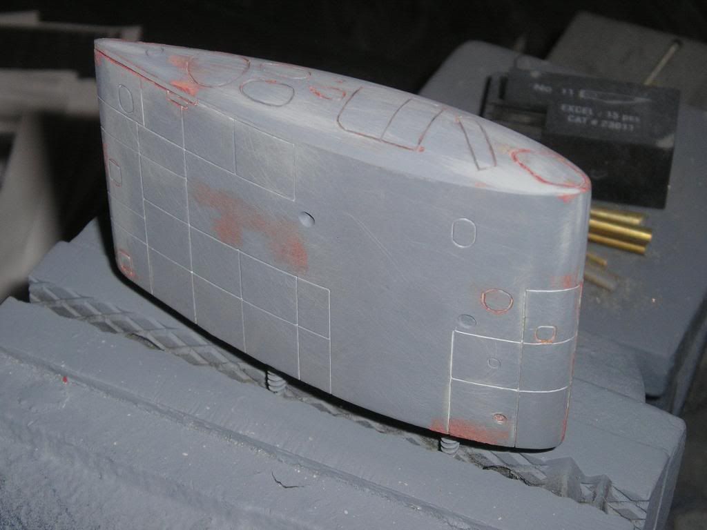 All of the red filler is applied after I do the rough scribe and want to clean the lines up. I’ll scribe the line, fill and then use my ultra pointy tool to go through the lines. I’ll let the filler dry and then sand the edges down and then prime to see how my work looks. I find I have to do this about 3 or 4 times already with maybe one or two rounds of this process to go. It sure does work though, the lines come out crisper each time I do this…Thanks Brian for the good advice!